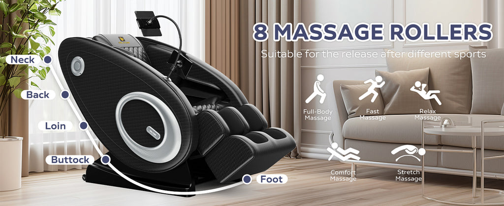 - [Full-body massage] The massage chair has 8 fixed rollers on the backrest to provide targeted massage therapy for your neck, back and lumbar area. You can choose from 5 preset automatic modes to customize your massage experience. It is also equipped with heating for the lumbar and leg areas to improve blood circulation and relieve sore muscles. The chair includes multiple airbags that provide adjustable pressure massage at three intensity levels for your shoulders, arms and calves.