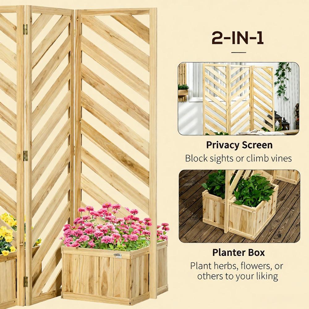 Features: - Three panel hinged outdoor privacy screen - Four planters on the corners make it a free-standing structure - Trellis like panels help climbing vines grow - Self-draining planters promote healthy soil - Hinges make it fit several types of spaces - Paint it to coordinate with your patio and plants - Outdoor-ready fir wood - Assembly required - See through, for dividing spaces only Specification: - Color: Natural Wood Color - Material: Fir Wood - Overall Size: 62.25' L x 19.75' W x 65' H - Single Panel Size: 20.75' W x 65' H - Raised Bed Size: 17.75' W x 9.25' D x 11.75' H - Raised Bed Inner Size: 16.5' W x 8' D x 11' H - Drainage Hole: 0.75' Dia. Package Includes: - 1 x Privacy Screen with Four Garden Beds - 1 x Manual
