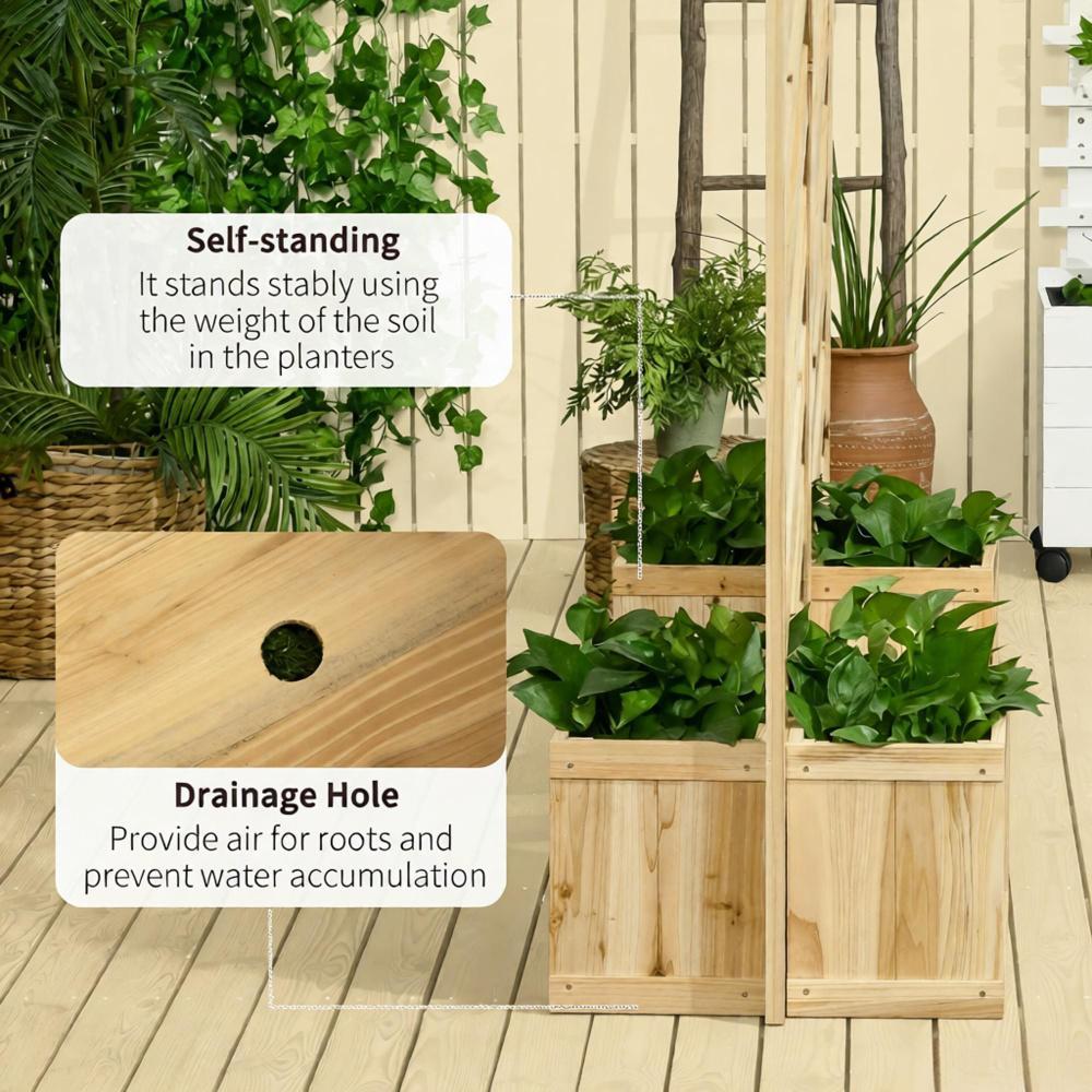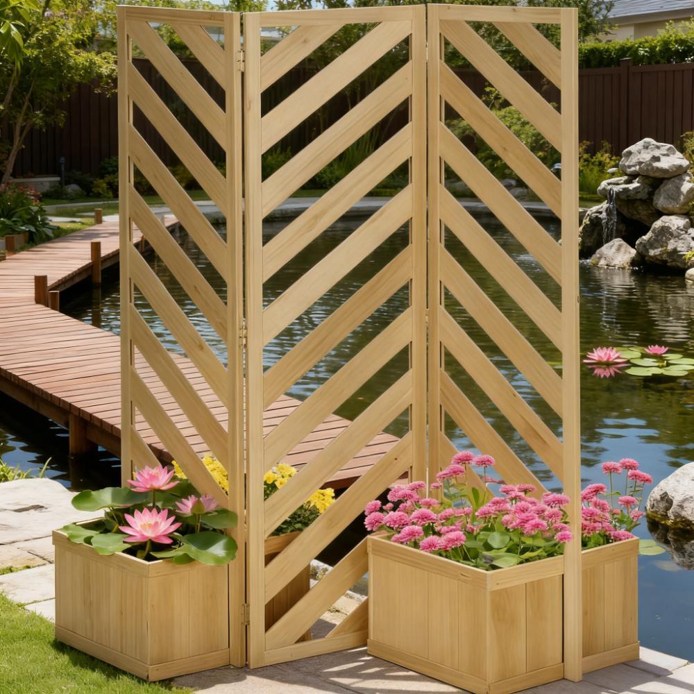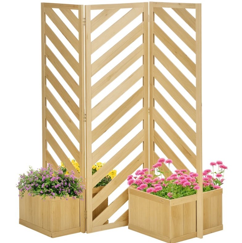 • - Four Small Planters & Trellis: This outdoor divider features four raised wooden garden beds. They're self-draining and help promote healthy moisture levels in soil, so water logging will be one less worry. Plant herbs, flowers, or vegetables, or even vines, the slatted design of the panels promotes the growth of climbing plants with a trellis like support structure.