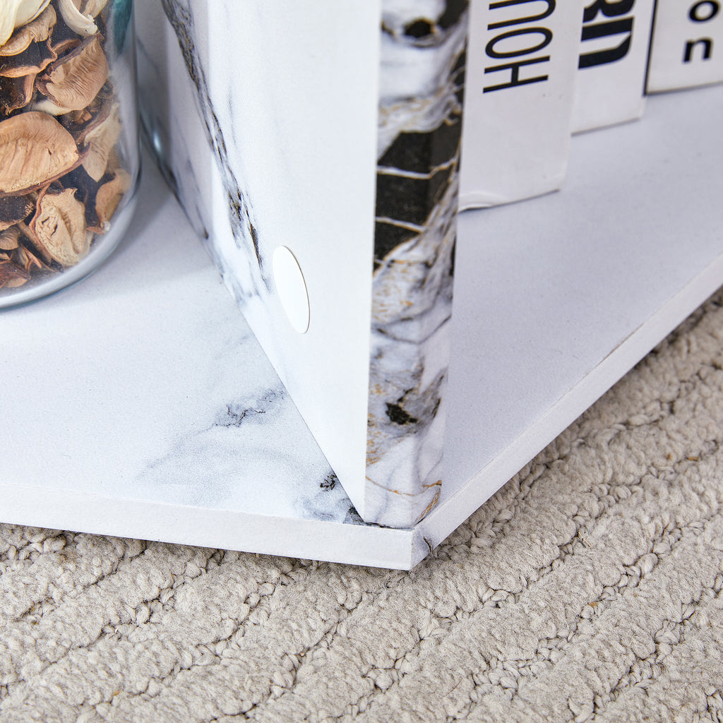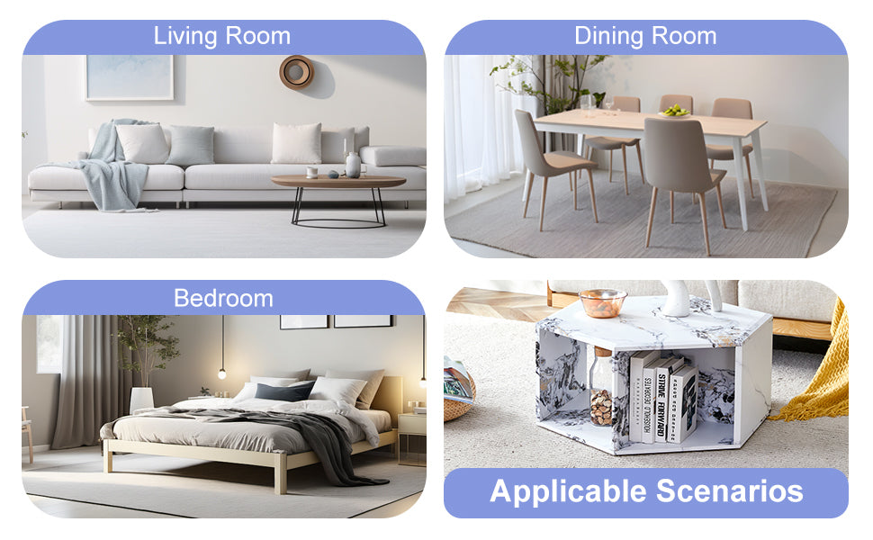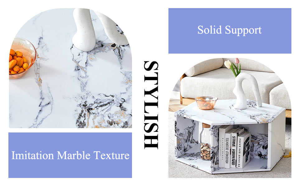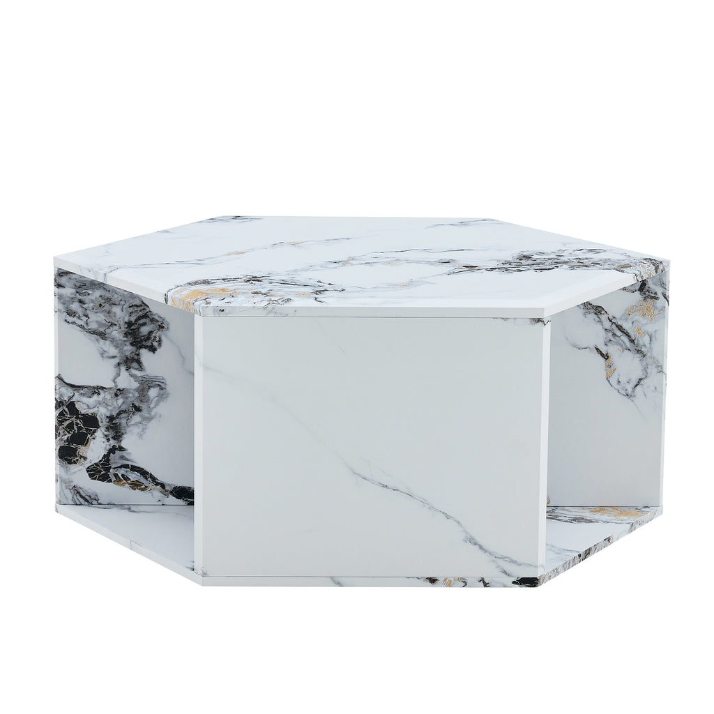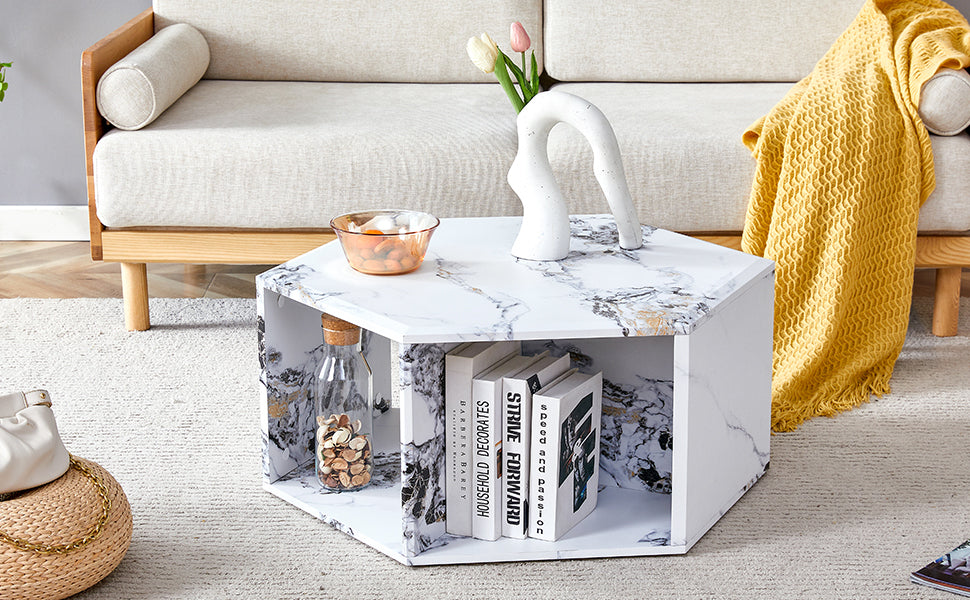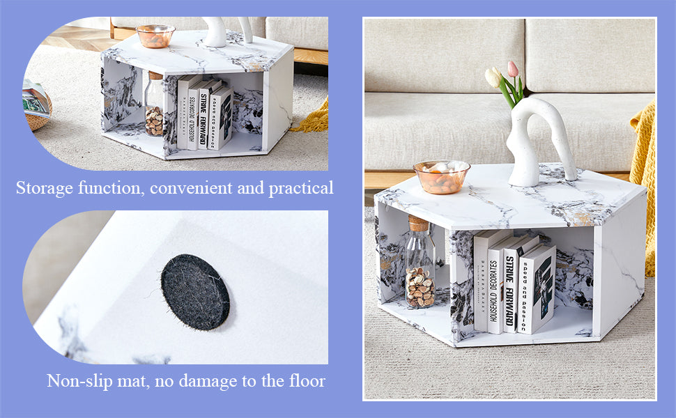 Hexagonal MDF coffee table, characteristic pattern stickers, multi-hole design to give more storage space, simple and convenient design makes it suitable for all kinds of style scenes.