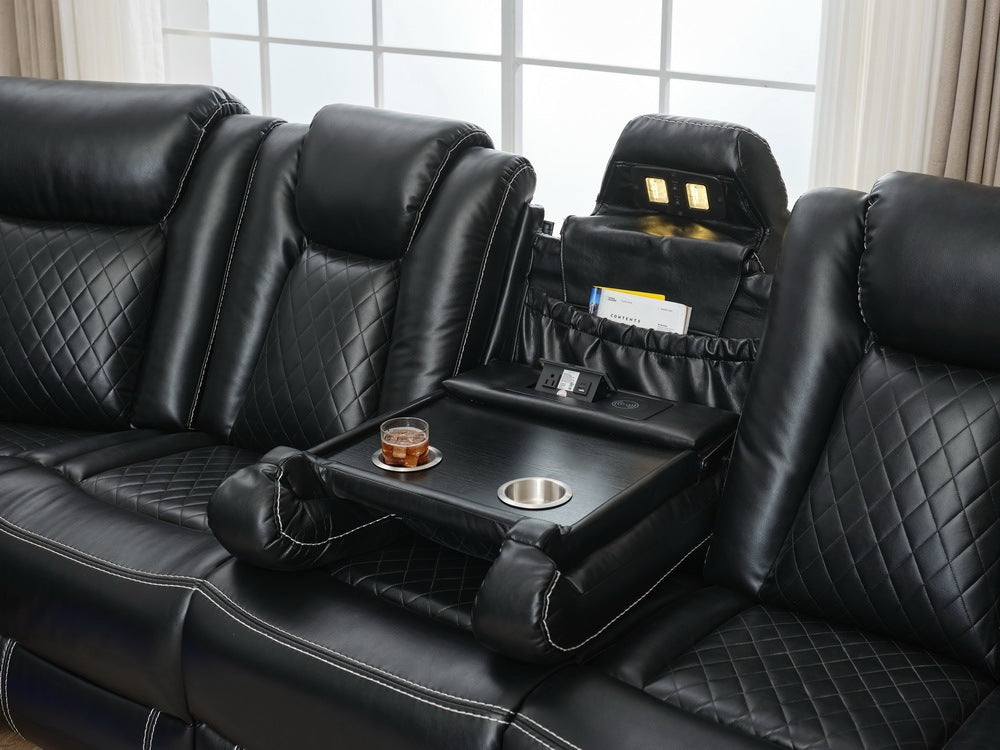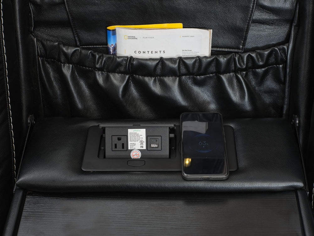 RAF loveseat with drop down table, reading lights, wireless charger, AC plug, stainless steel cupholders