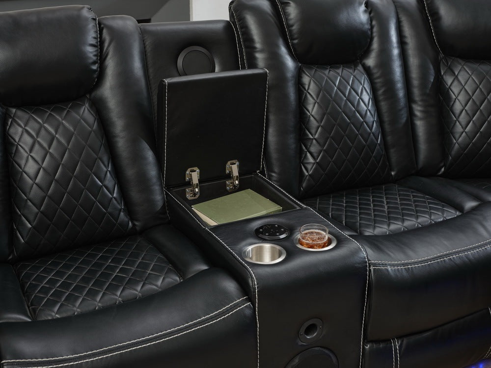 LAF reclining loveseat console with Bluetooth Speaker, stainless steel cupholders and storage.