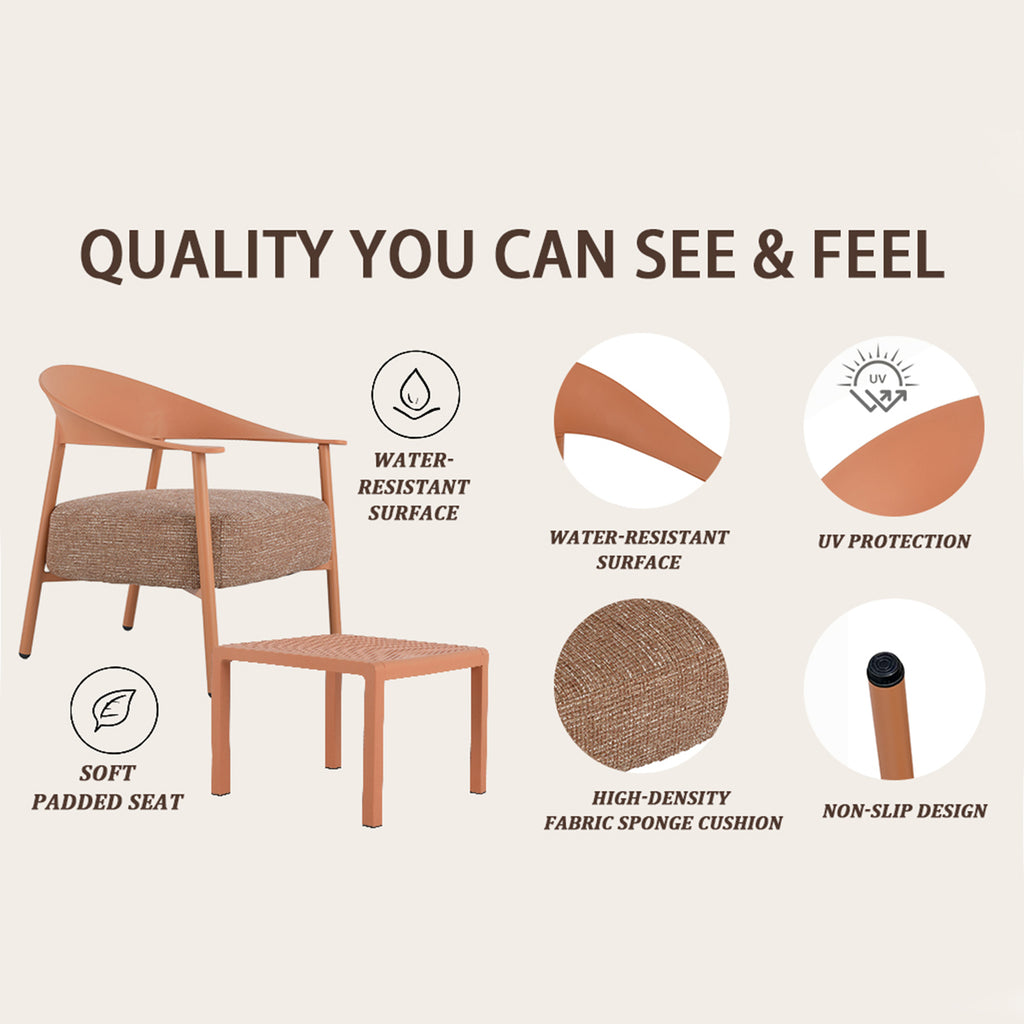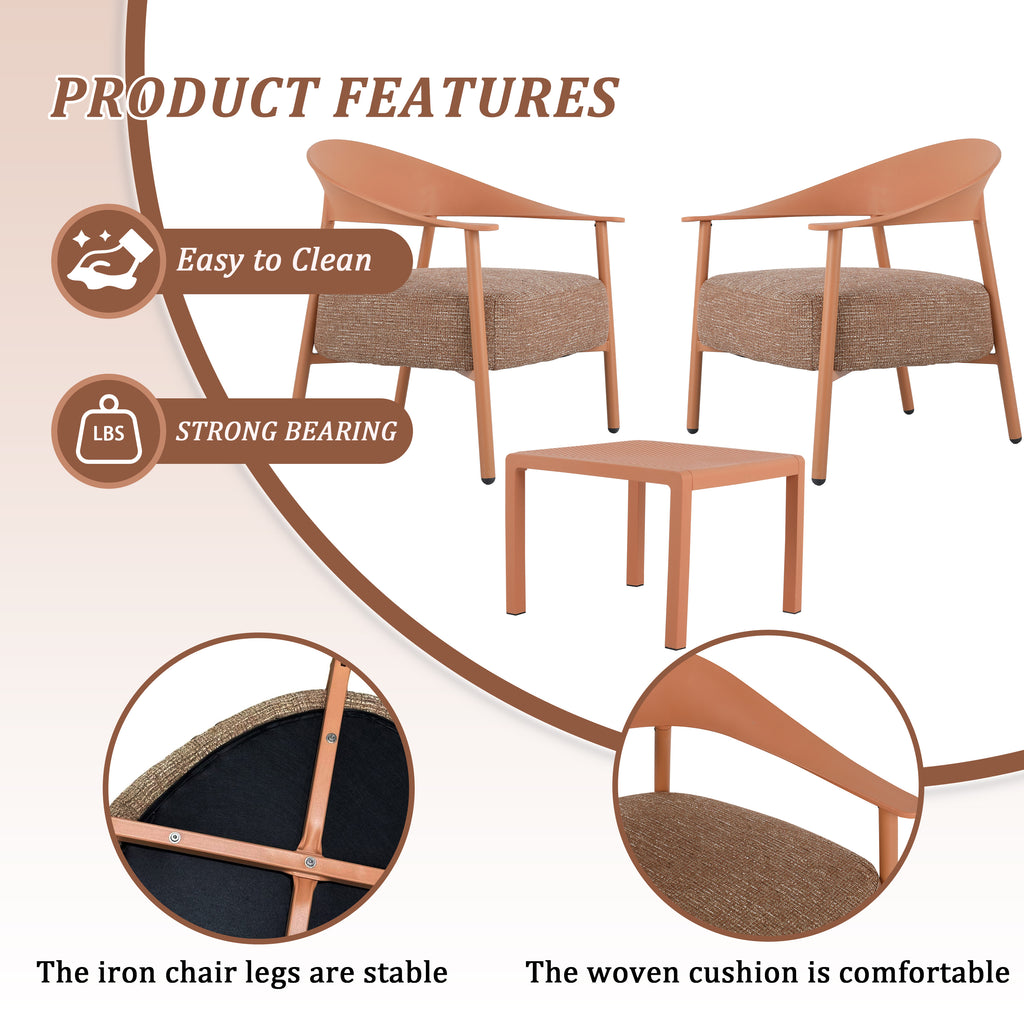 Furniture set with seat cushions, sturdy and durable, in apricot brown. Dimensions: 29.13*25*29.53 (in)/19.69*19.69*14.96 (in). Chair body made of plywood, powder-coated metal legs, and PP table.