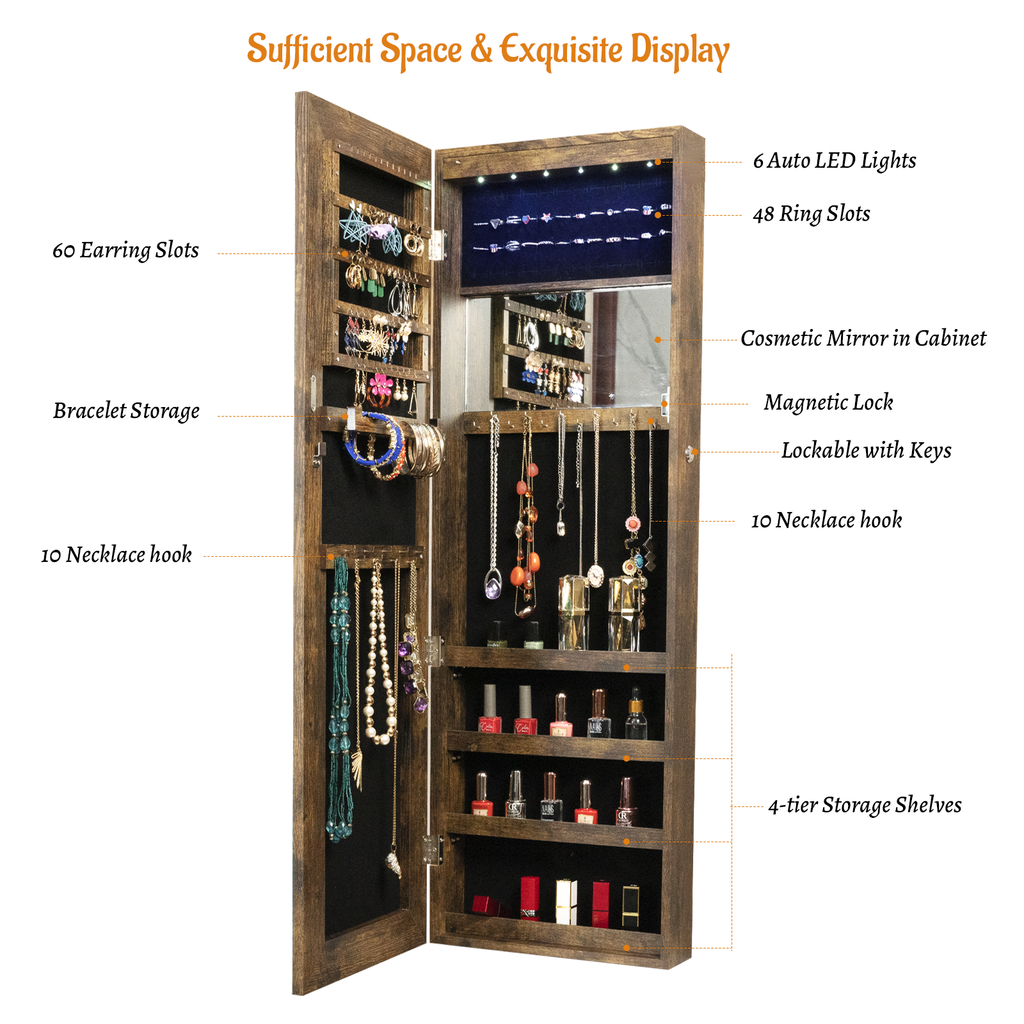 • WALL & DOOR MOUNT ARMOIRE: You can mount the jewelry cabinet on the wall with included screws to save floor space; also 3 adjustable heights available when hanging the jewelry organizer over the door with hooks. It fits almost anywhere, including closets or decorative displays, to complement any decorative style.
