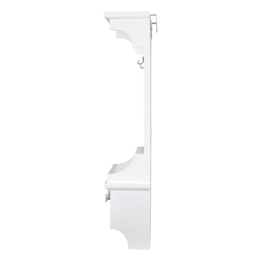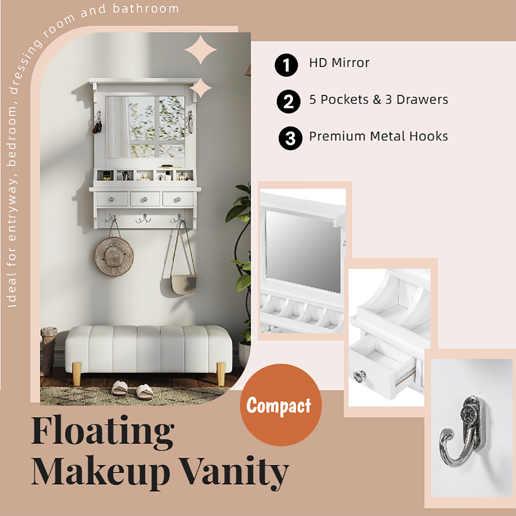 Floating Makeup Vanity with Big Mirror, Wall-Mounted Storage Vanity with Drawers, Pockets & Hooks, Space-Saving Decorative Home Organizer, White, Engineered Wood, 23.8 x 6.1 x 31.8 inches
