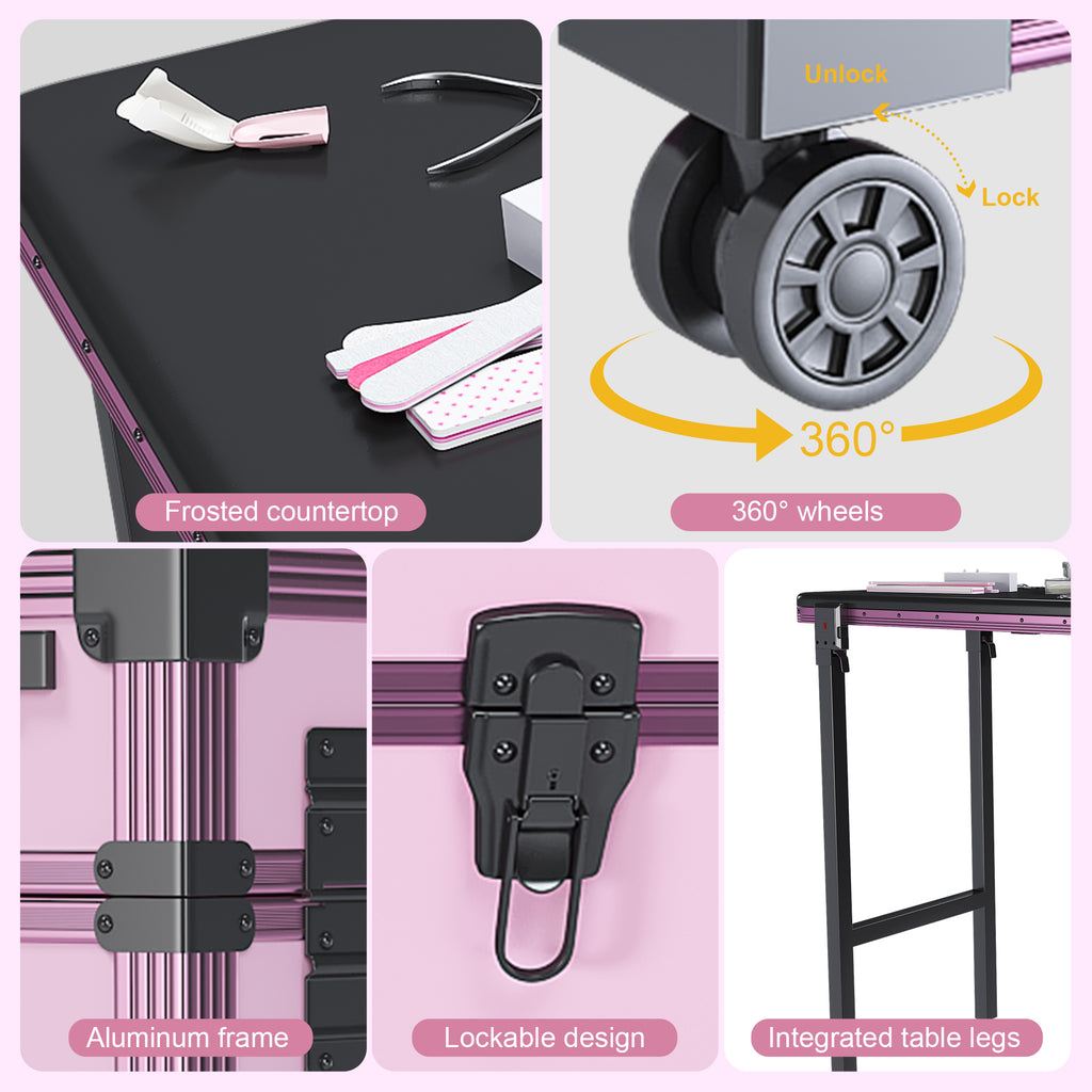 • ALL-IN-1 SALON SOLUTION – Combines a professional worktable, giant cosmetic organizer (makeup, brushes, etc.), and mobile convenience—built to last for pros and passionate DIYers.