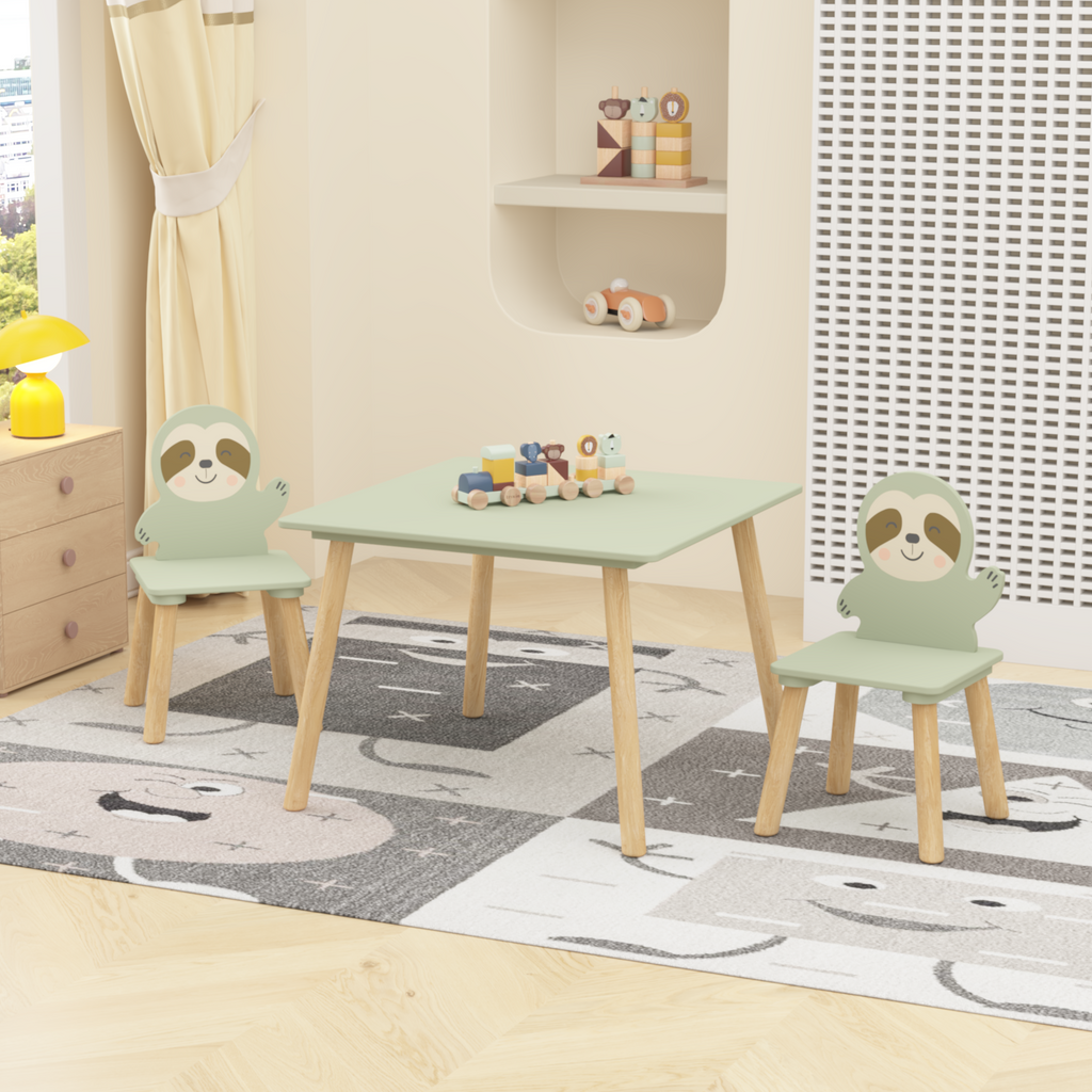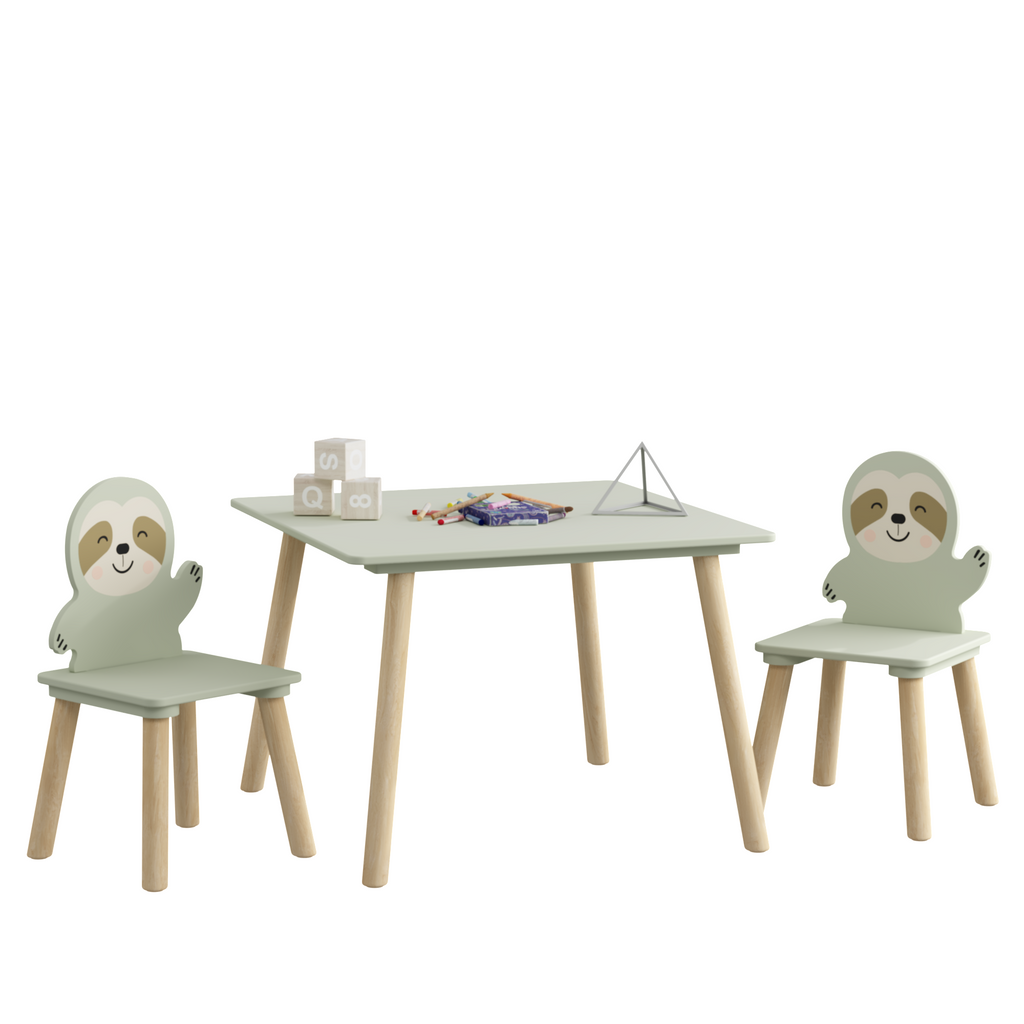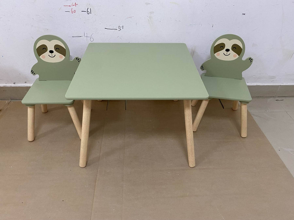 Kids Table and Chair Set with 2 Cute Sloth Chairs, Wooden Toddler Activity Table, Cute Animal Design Play & Study Set for Playroom, Bedroom, Classroom – Sage Green & Wood