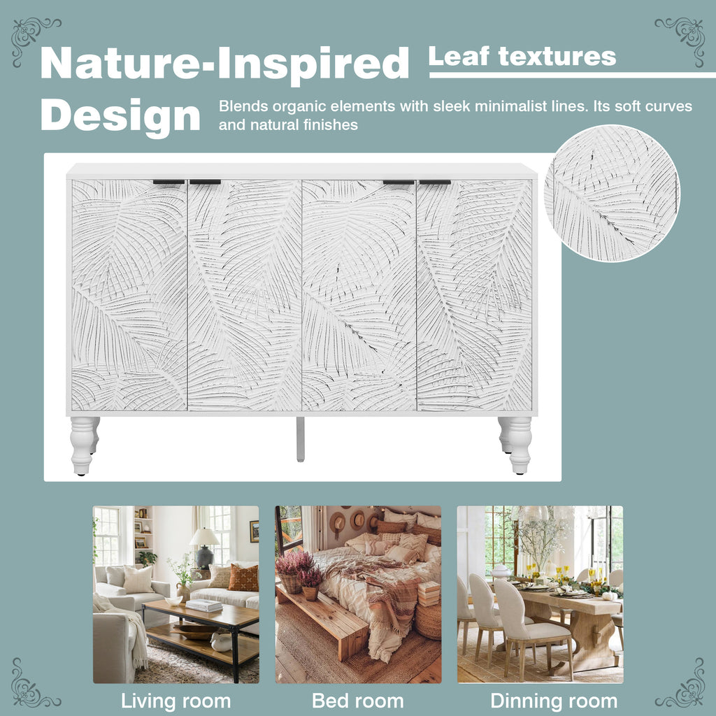 This sleek and modern TV stand, characterized by its stylish and flowing line design, seamlessly integrates modern aesthetics with natural allure. The intricate leaf patterns adorning its cabinet door breathe life into the indoor ambiance. Its refined handle design not only ensures a comfortable grip but also enhances the overall user experience. Positioned in either a spacious living room or a cozy bedroom, it swiftly captures attention, adding a vibrant touch. Featuring two spacious storage compartments and adjustable shelves, the TV cabinet offers versatile storage options tailored to meet a wide range of needs. From electronic gadgets to daily trinkets, it provides ample space for easy storage. Additionally, the inclusion of an anti-tipping device ensures heightened safety. Complete with all parts and comprehensive assembly instructions, the installation process is rendered straightforward and swift.