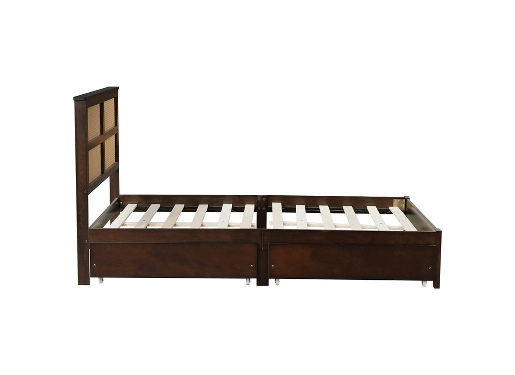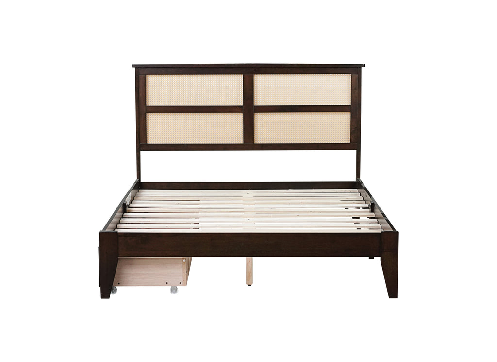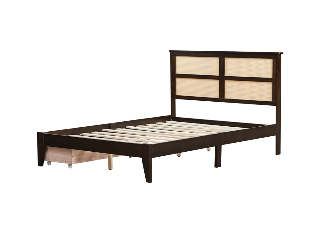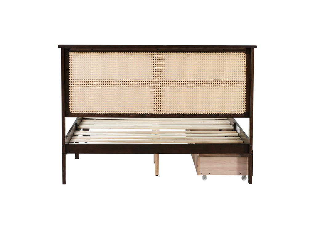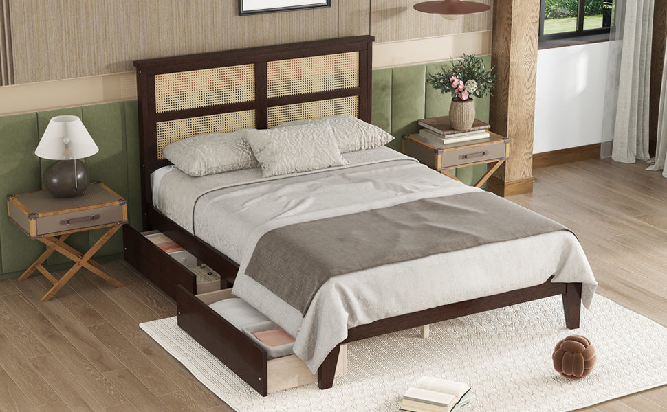 Full Size Bed with Rattan Headboard, Two Storage Drawers