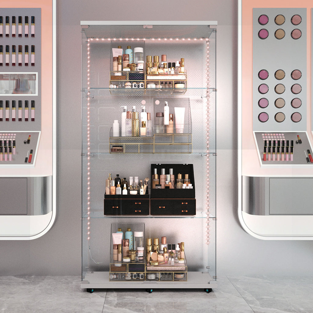 • The use of tempered glass can minimize the risk of cuts in case of accidents, offering both aesthetics and safety. Equipped with casters at the, it can meet your needs for placement in various locations. The casters come with a locking mechanism, allowing you to fix it in a specific position as needed.