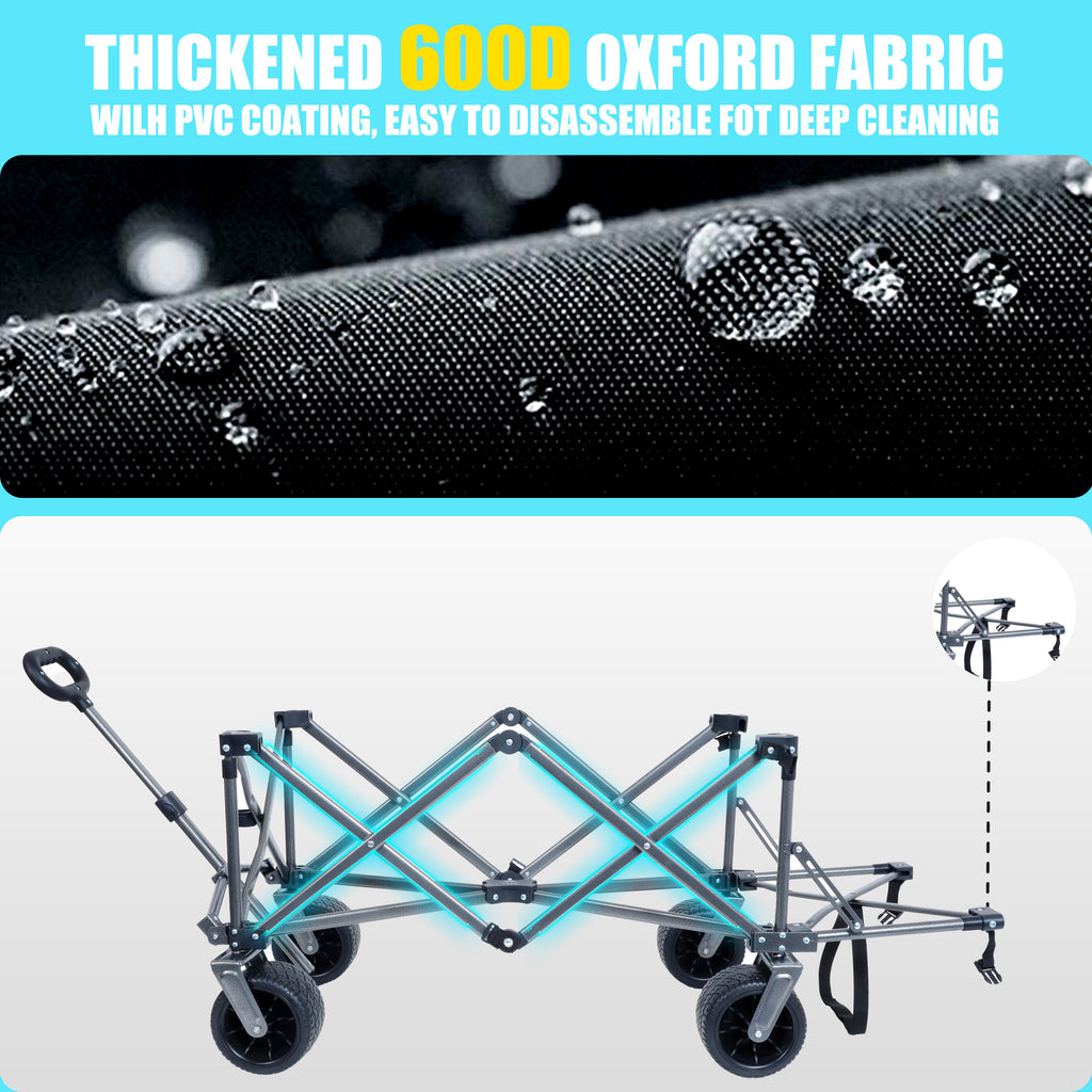 • Durable & High-Capacity BuildBuilt with a rugged frame that supports up to 400 pounds, this wagon is engineered for durability and reliability. The high-quality 600D Oxford double-layer fabric resists tears—even when transporting sharp-edged items—and is removable and washable for easy upkeep.