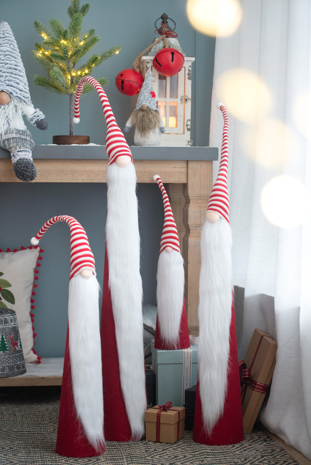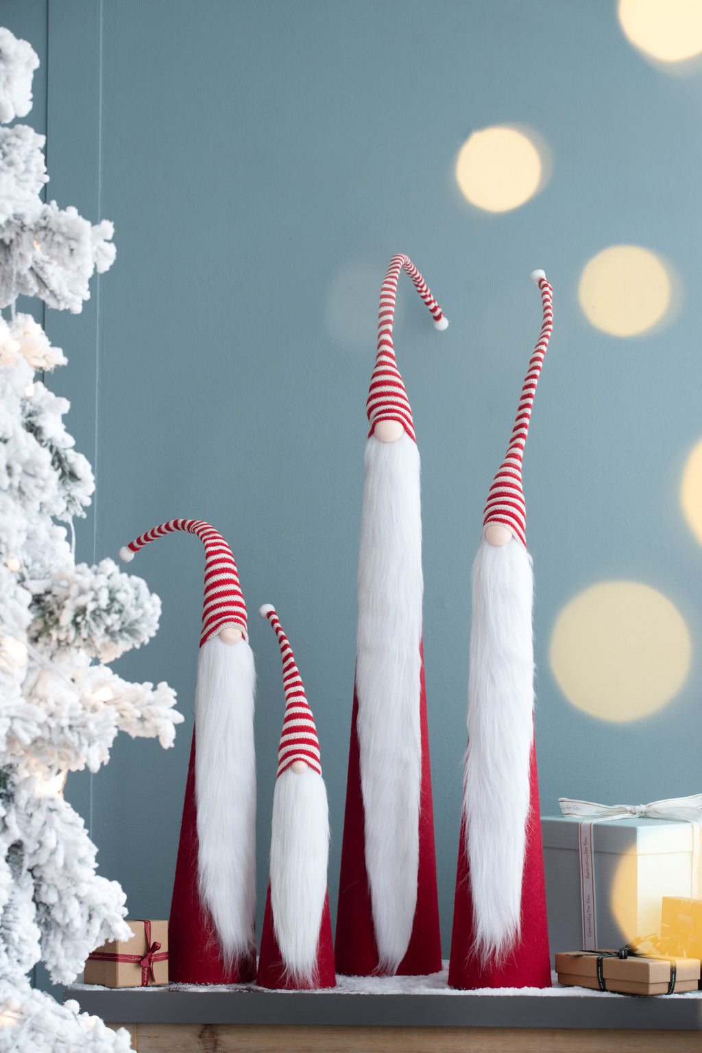 This set of four Santa skinny gnomes that wear long flowing beards and red and white striped stocking caps are a whimsical addition to Christmas decor. Included in this set is are various sizes of cone gnomes, from small to extra large. Snowballs top these old world inspired, suited gnomes made of polyester and iron. Decorate the living room or kitchen with these stylized holiday pieces.