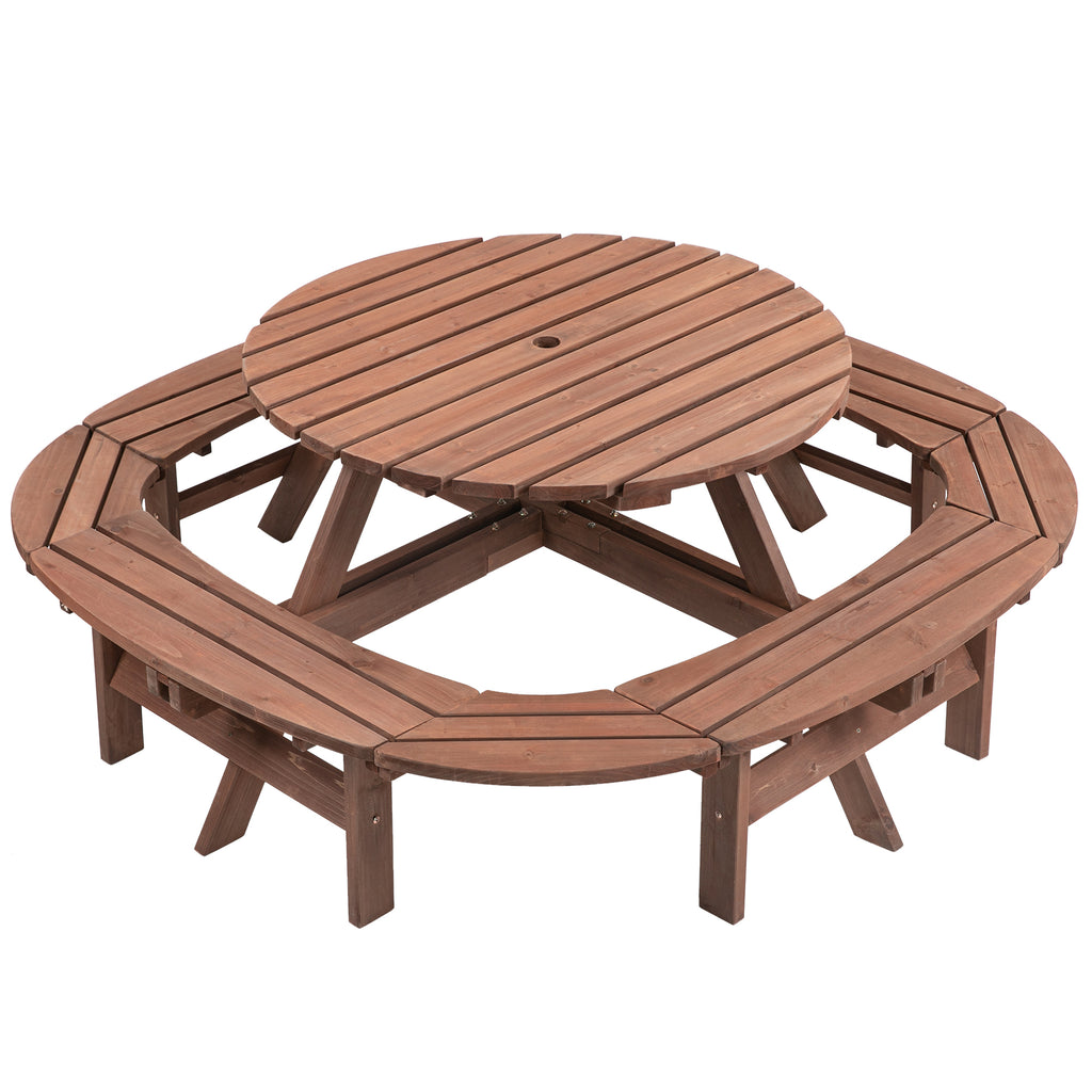 10-12-person Round Outdoor Wooden Picnic Table for Patio, Backyard, Garden, DIY with 1 Built-in Ring Stool, 500-lb Weight Capacity - Walnut Brown