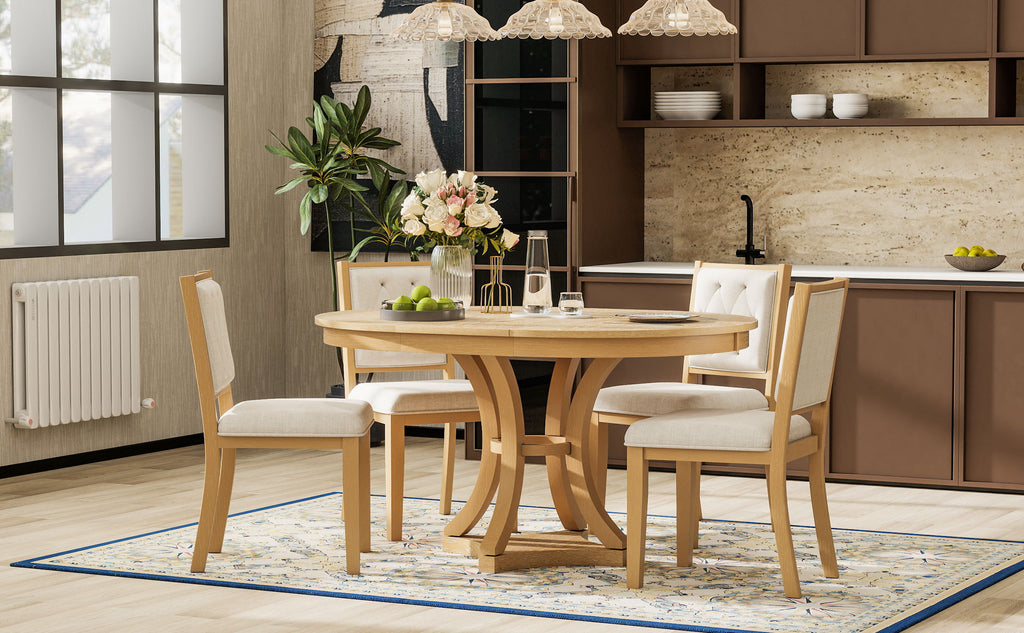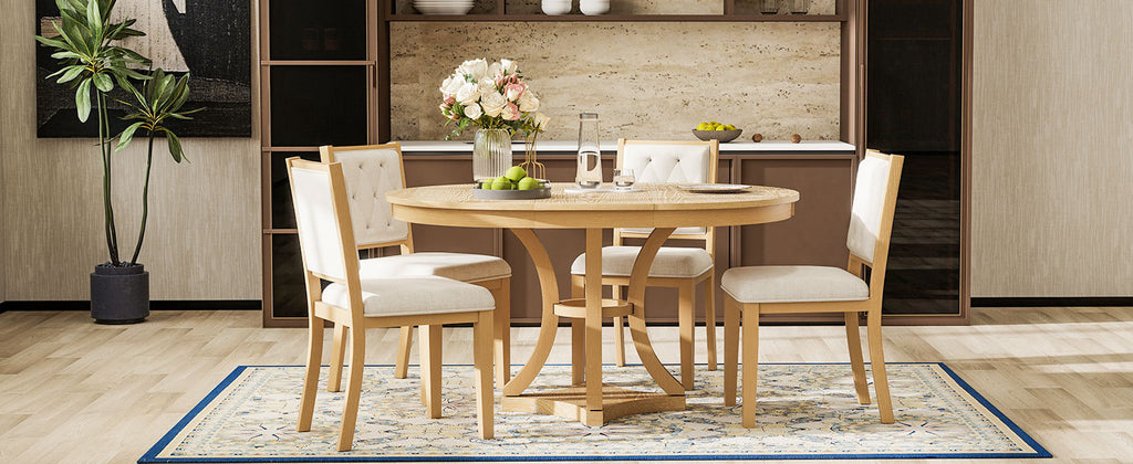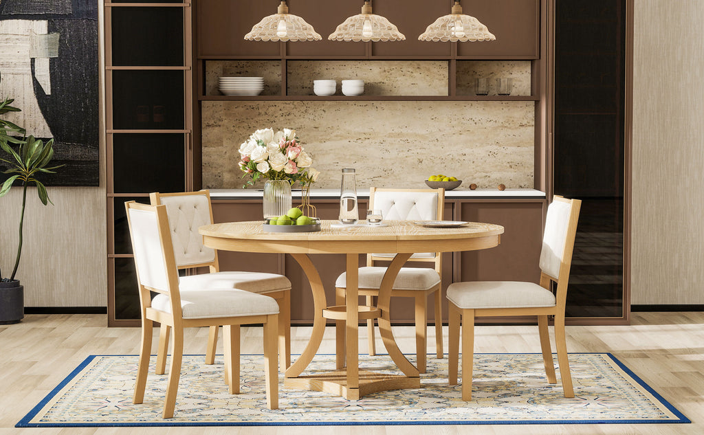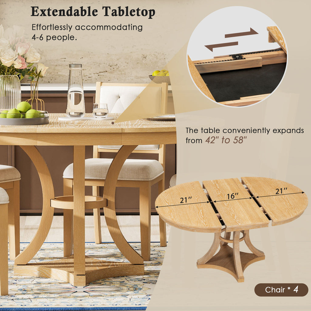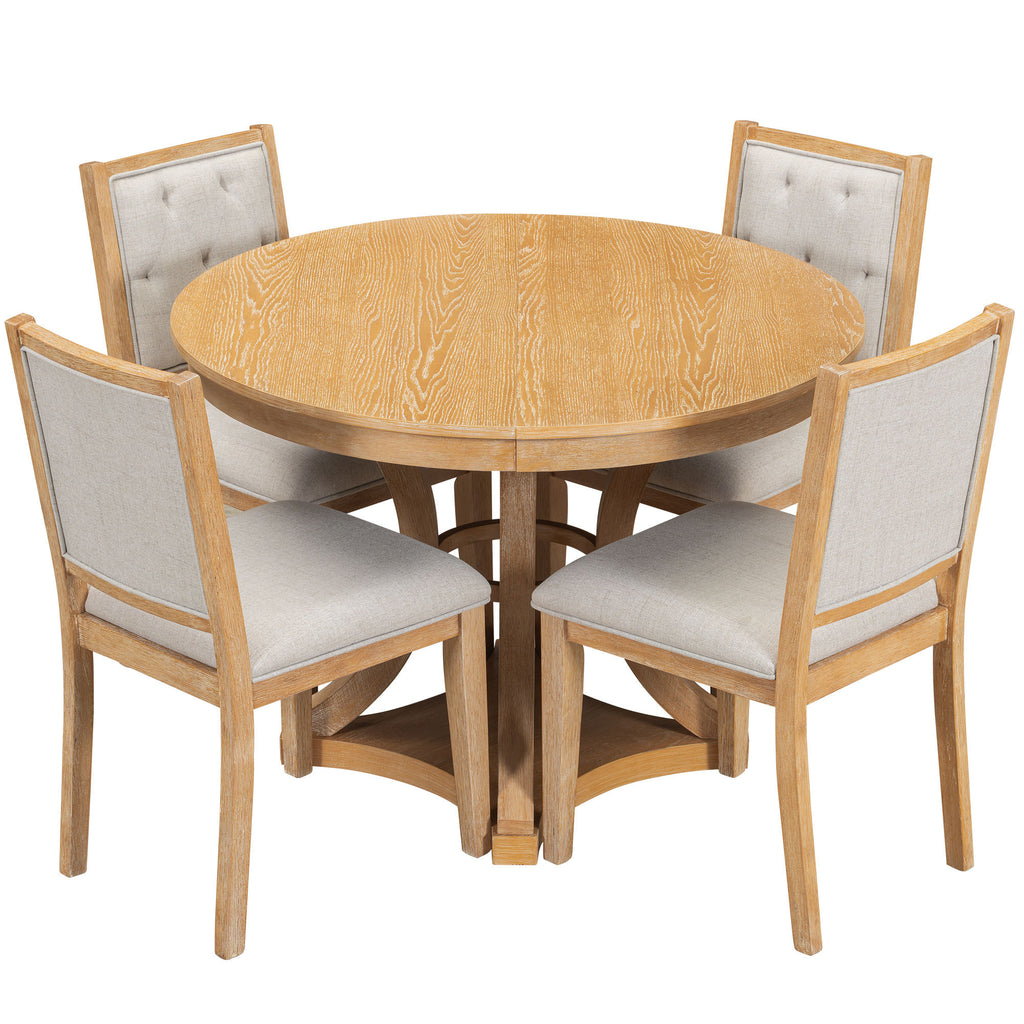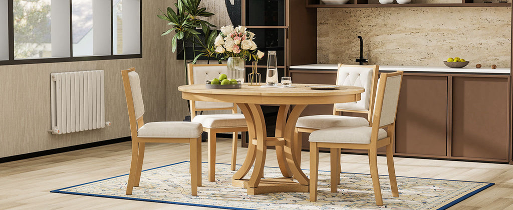 - 5-piece Vintage Dining Table Set for 4: Complete your dining room with this charming 4-piece kitchen table set featuring 1 extendable table and 4 matching chairs. Veneered with natural Oak wood with beautiful wood grain, this set brings a warm, rustic elegance to your space. Perfect for everyday meals or entertaining guests, this round dining table set combines vintage charm with practical functionality to create a welcoming dining experience.
