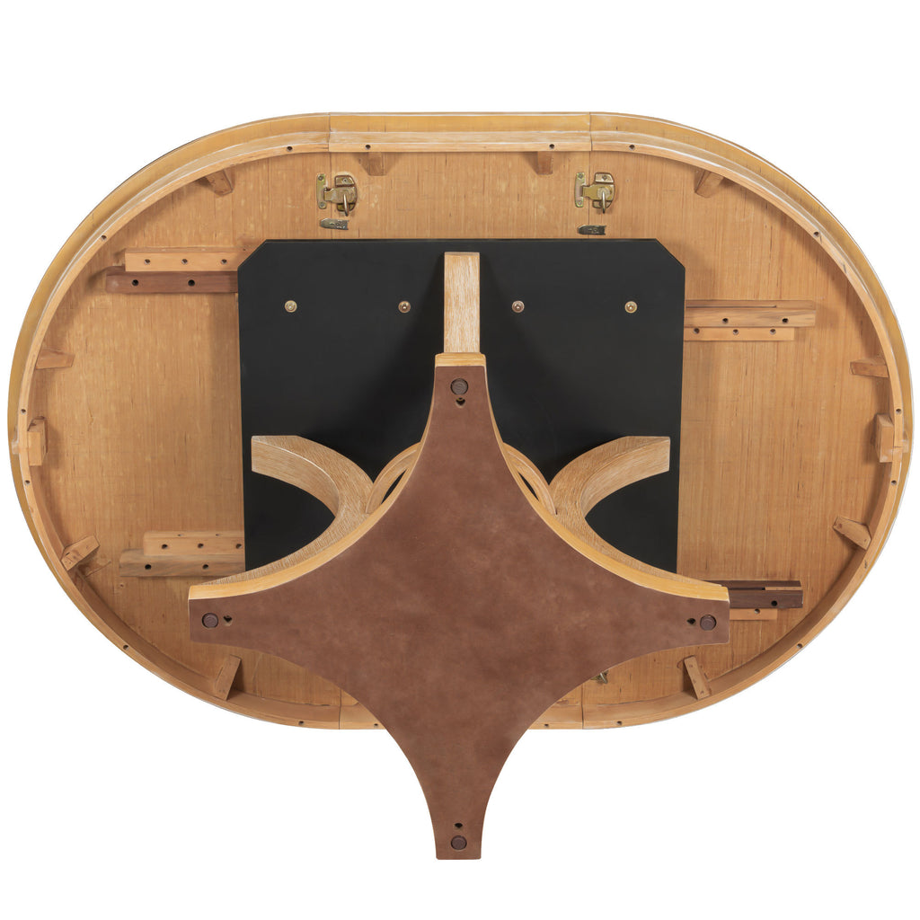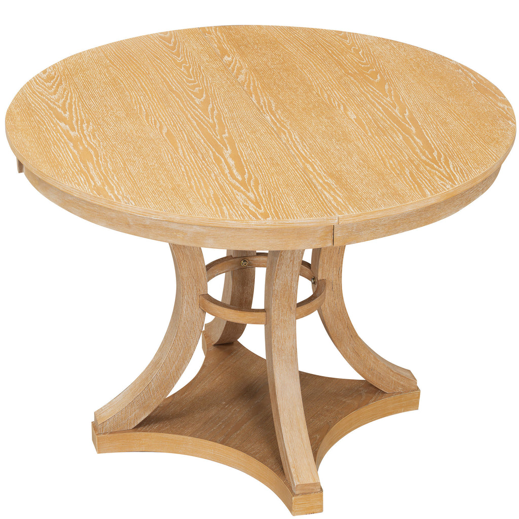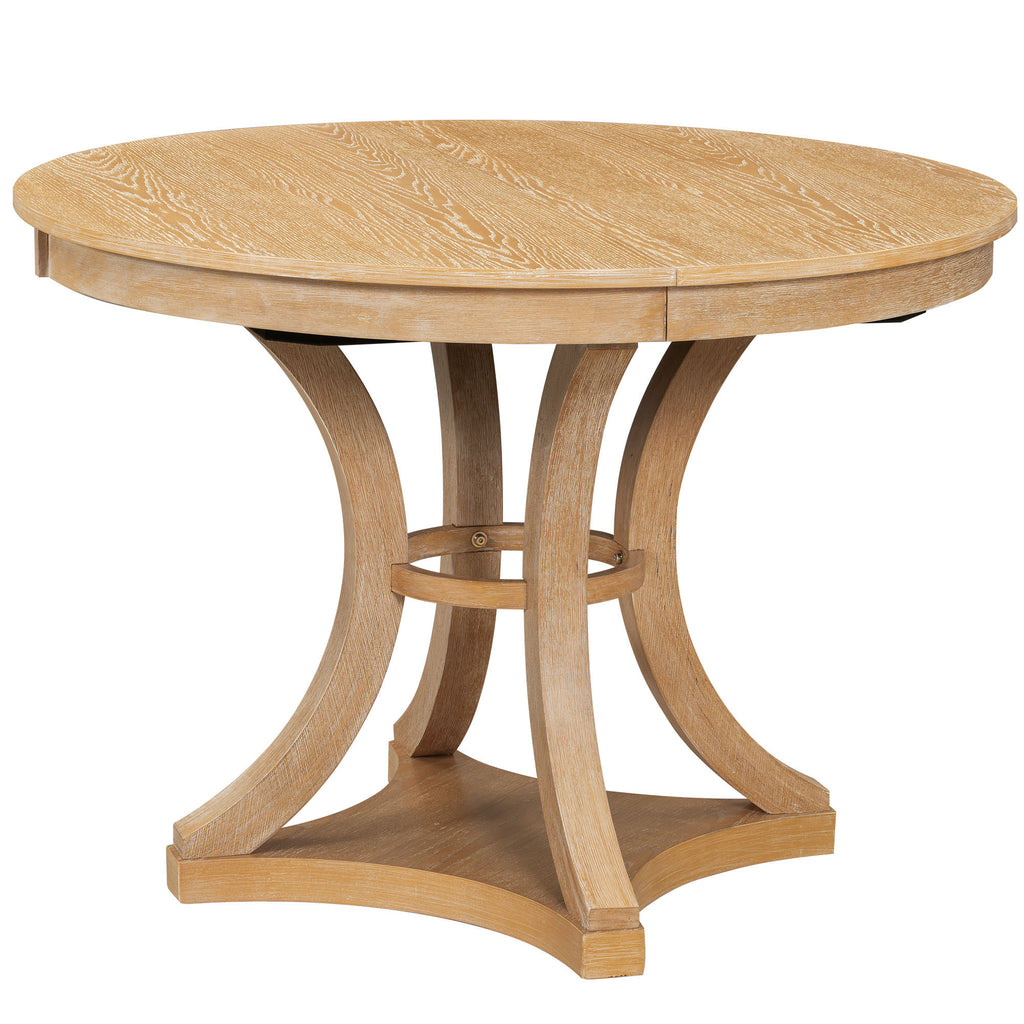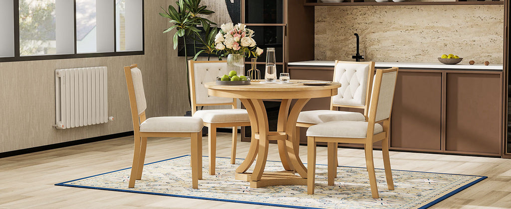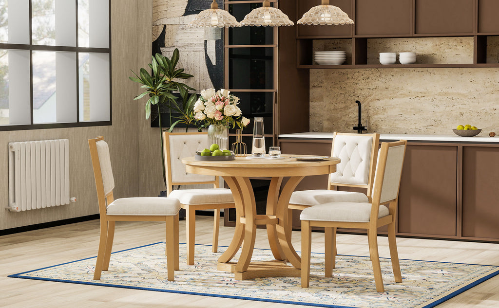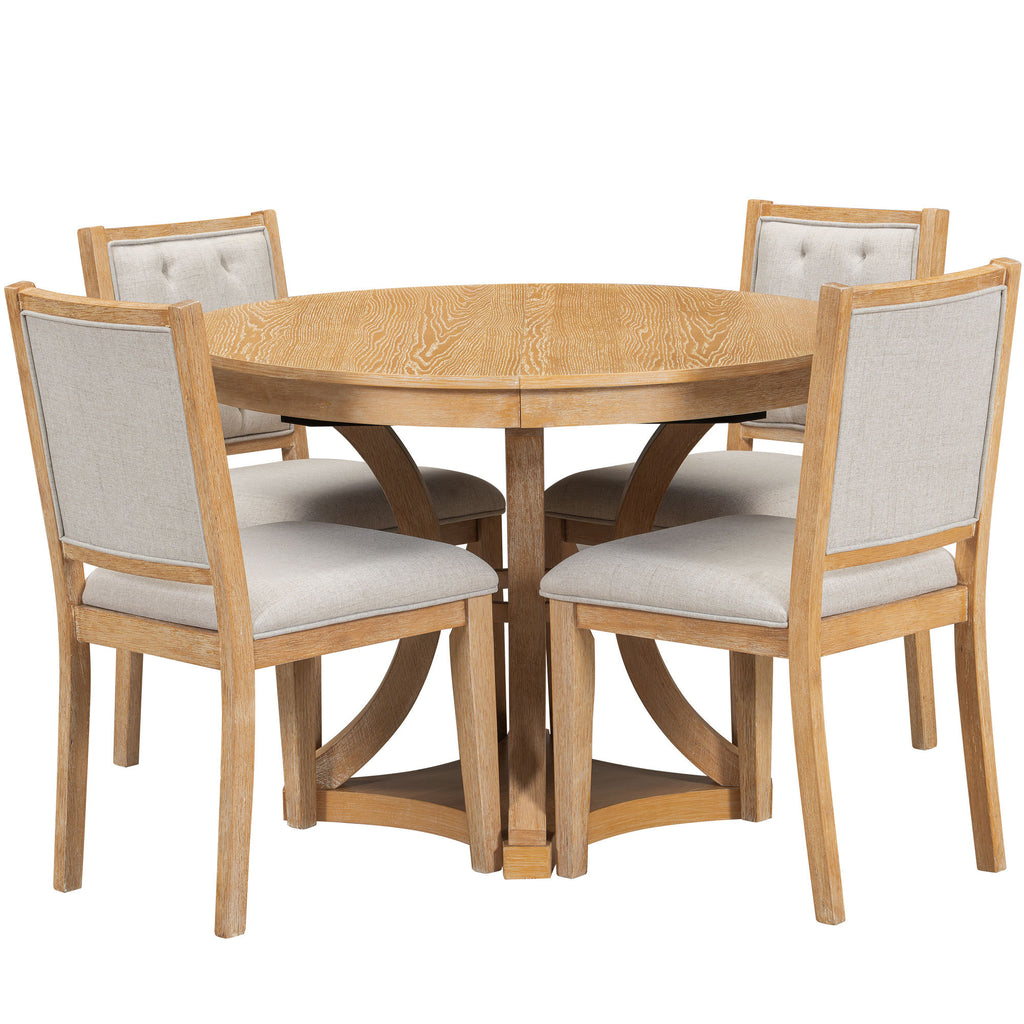 - 5-piece Vintage Dining Table Set for 4: Complete your dining room with this charming 4-piece kitchen table set featuring 1 extendable table and 4 matching chairs. Veneered with natural Oak wood with beautiful wood grain, this set brings a warm, rustic elegance to your space. Perfect for everyday meals or entertaining guests, this round dining table set combines vintage charm with practical functionality to create a welcoming dining experience.