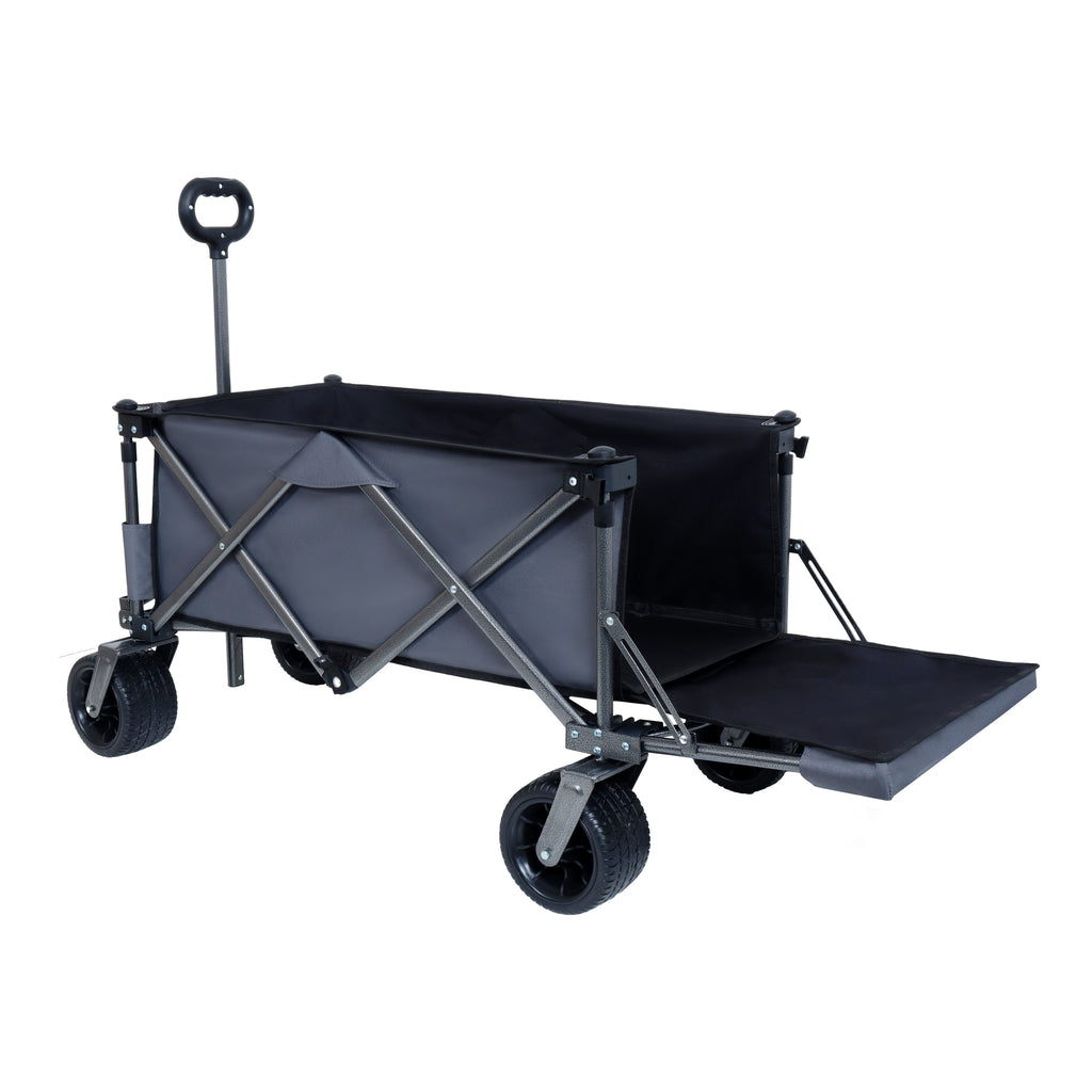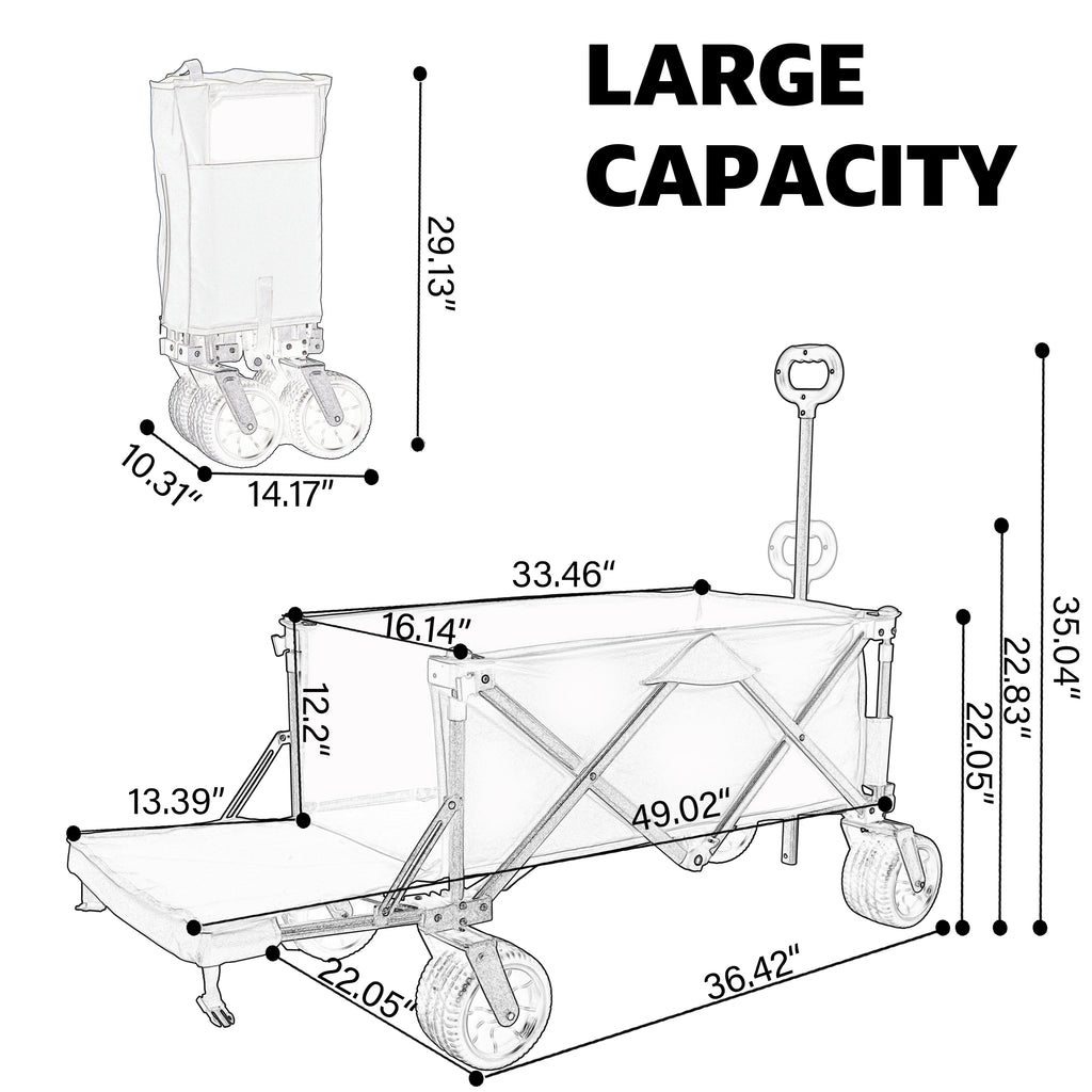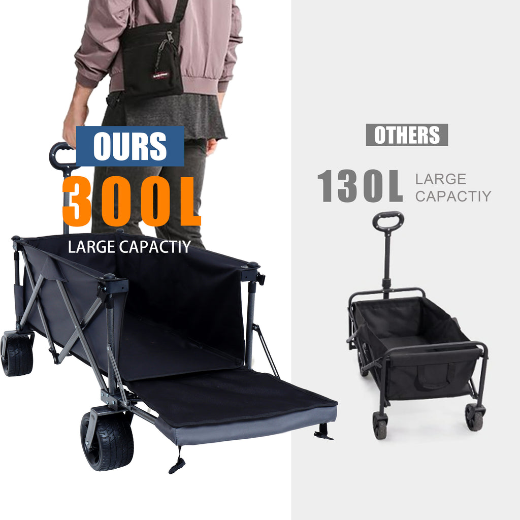 • Spacious & Versatile DesignWith a generous 300L capacity and an extended length of up to 49 inches, this collapsible wagon cart easily accommodates bulky items—from heavy outdoor gear and camping essentials to household goods and groceries. Its flexible design, including an extra-wide 14-inch extendable tailgate, adapts effortlessly to your various transportation needs.