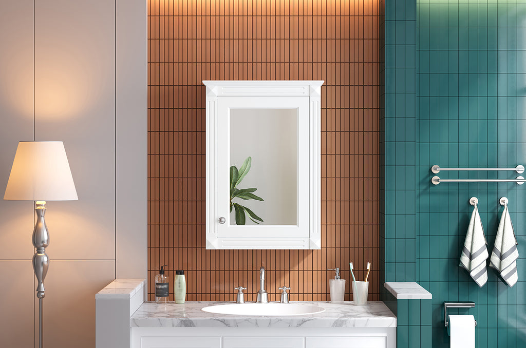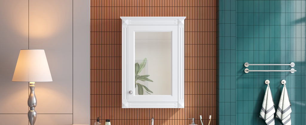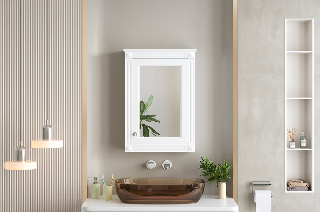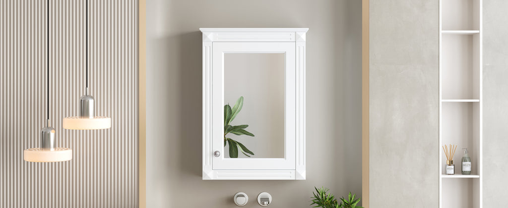• [Minimalist Chic Style] Crafted from Natural Pine wood and Composite Panels , the medicine cabinet features a clean white finish for a pure look. Accentuated by a mirrored door, it reflects light beautifully, elevating the overall aesthetic with sophistication.