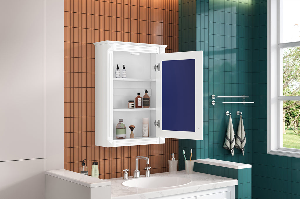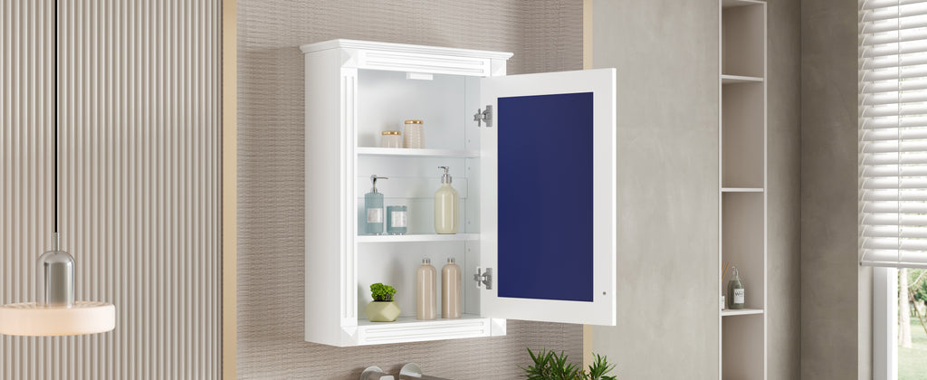• [2-in-1 Bathroom Mirror & Medicine Cabinet] This bathroom mirror cabinet seamlessly combines storage and mirror functions. Designed for versatility, it features a crystal-clear mirror while providing hidden space behind the door to organize bathroom essentials.