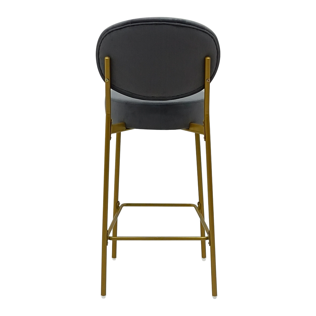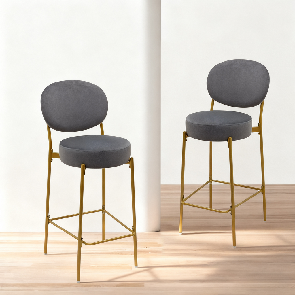 Elevate the style of your kitchen, dining room, or home bar with these modern and luxurious bar stools. The golden metallic stool frame and high-end velvet seat create a harmonious blend of sophistication and comfort. The clean lines of the golden base and soft seat surface add a touch of glamor to any setting. Designed with your comfort in mind, these bar stools feature a circular footrest to reinforce stability and provide an extra degree of leg relaxation. Each leg also has an adjustable footpad to prevent scratches and scuffs on your floors while ensuring all four legs remain level. Versatile and stylish, these bar stools are the perfect addition to any space. The contemporary design and good color coordination make them a stylish addition to your kitchen, dining room, home bar, café, pub, or restaurant. Get this pack of 2 barstools and add glamour to your designated place.
