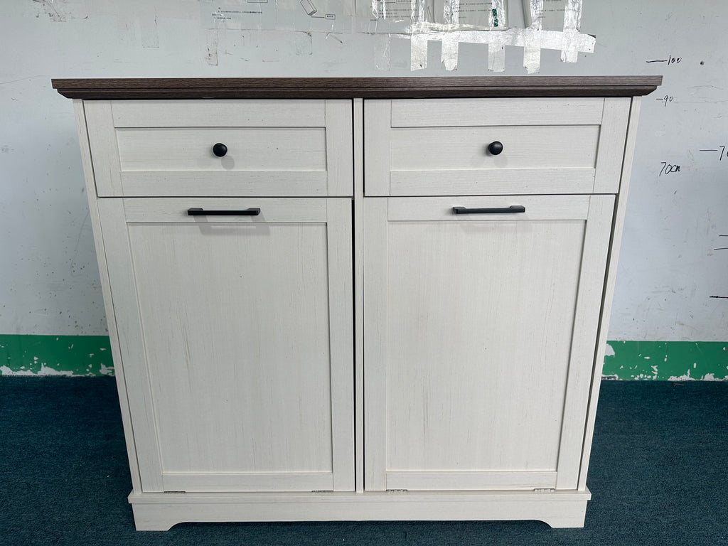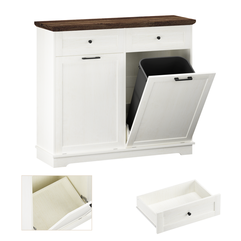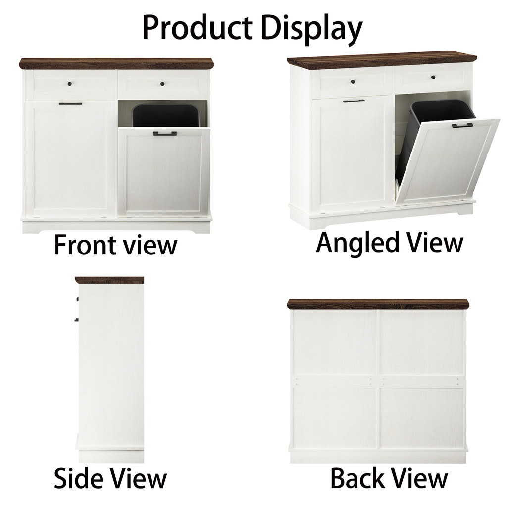 • Modern Trash Cabinet: Double Tilt out trash cabinet is simple and practical. It can be easily incorporated into a variety of decorating styles. It will be perfect for dressing up your kitchen, home, apartment, dorm room, etc. It also can be used as a kitchen island or suitable to store dog food, cat food, etc., and the top can be used to place decorations, daily supplies and so on