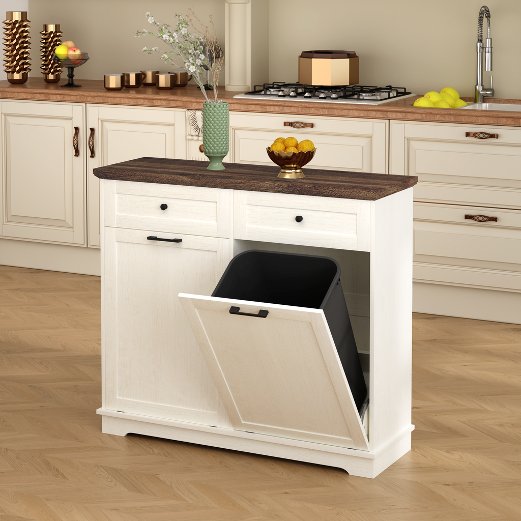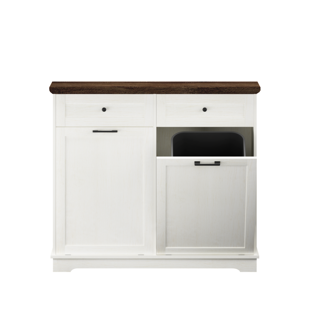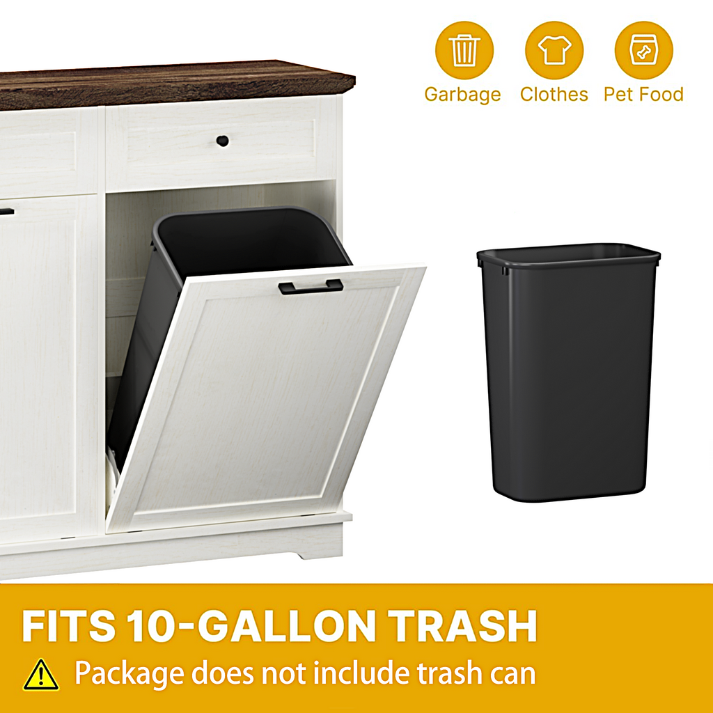 20 Gallon Double Tilt Out Trash Can Cabinet Freestanding Trash Bin Cabinet Wood Garbage Recycling Cabinet with Hideaway Drawer Pet Proof Trash Can Holder for Kitchen Living Room, Antique White