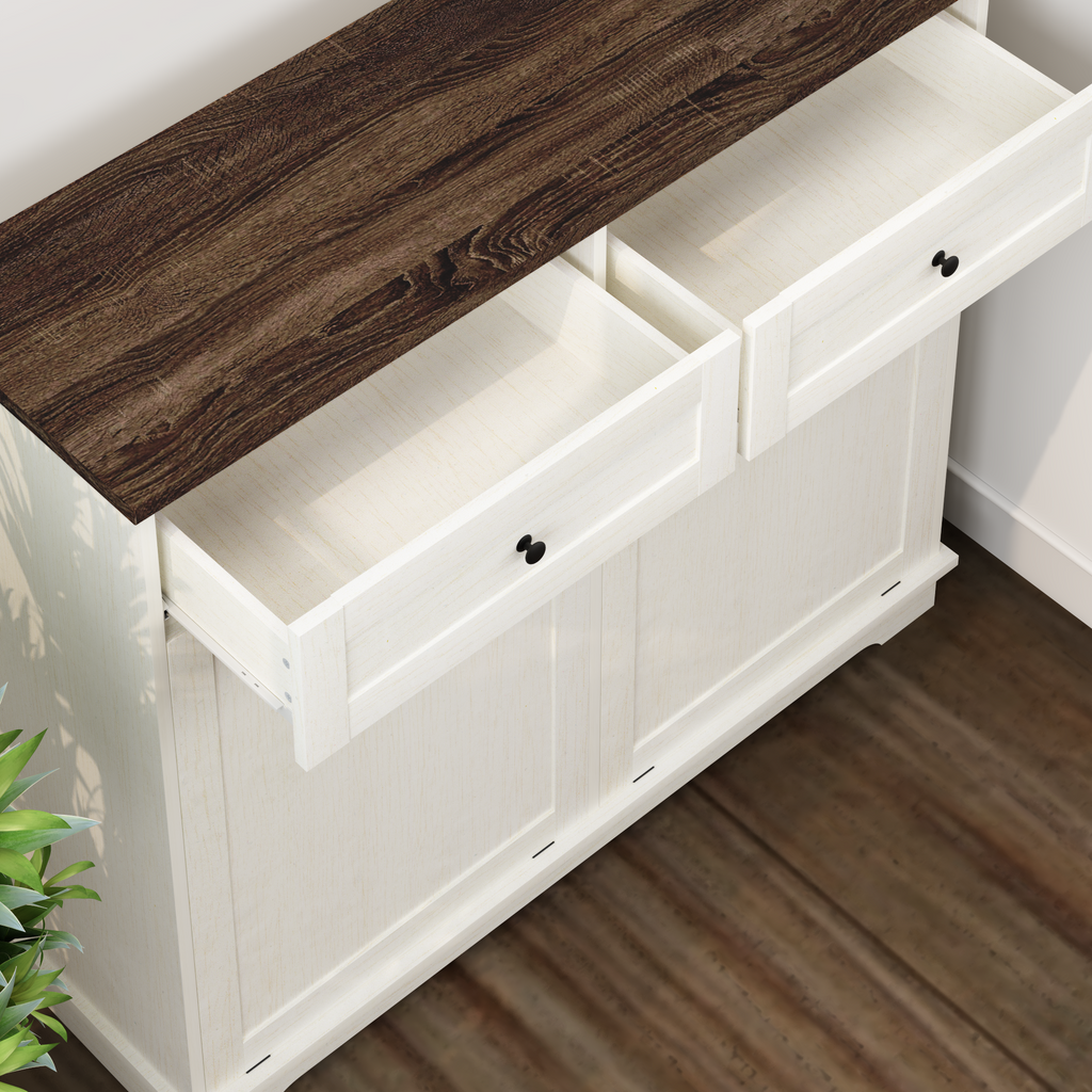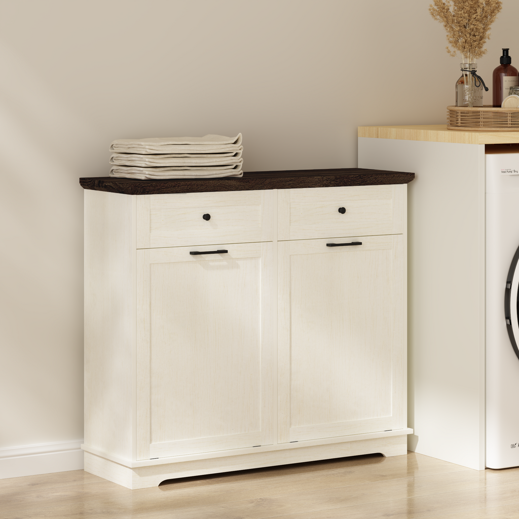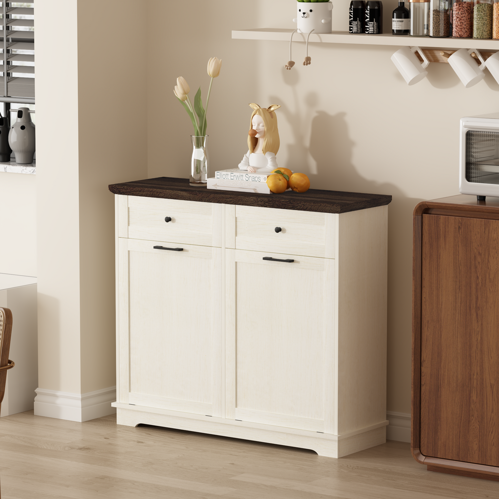 20 Gallon Double Tilt Out Trash Can Cabinet Freestanding Trash Bin Cabinet Wood Garbage Recycling Cabinet with Hideaway Drawer Pet Proof Trash Can Holder for Kitchen Living Room, Antique White
