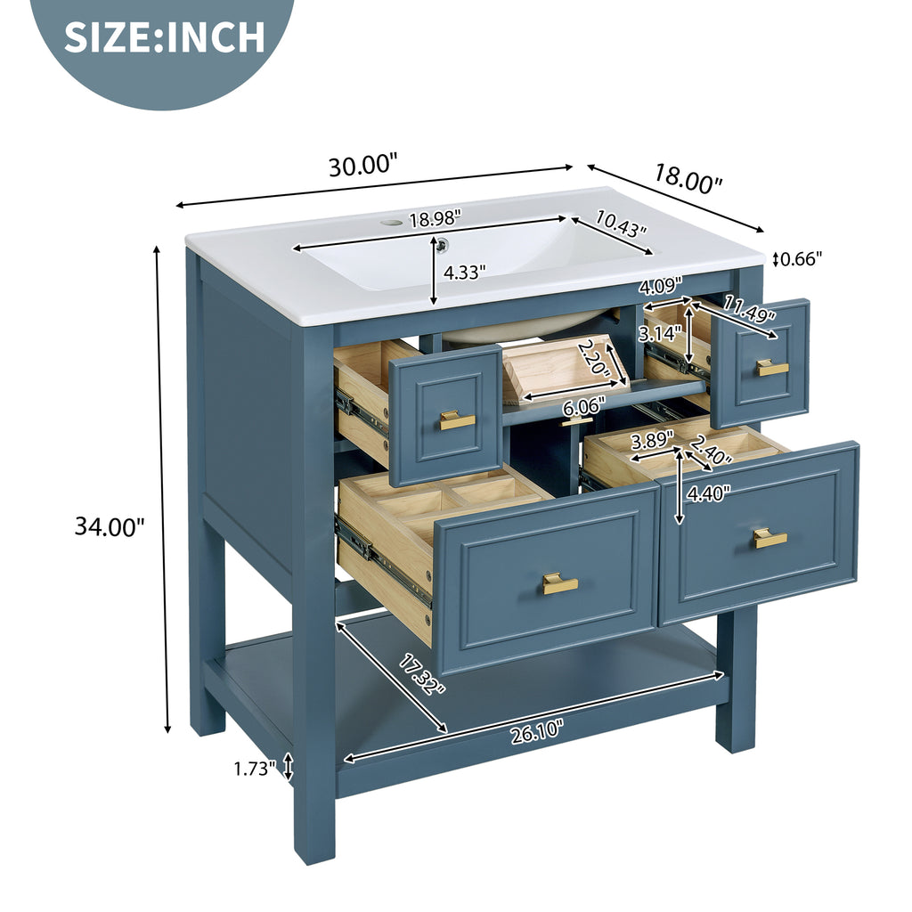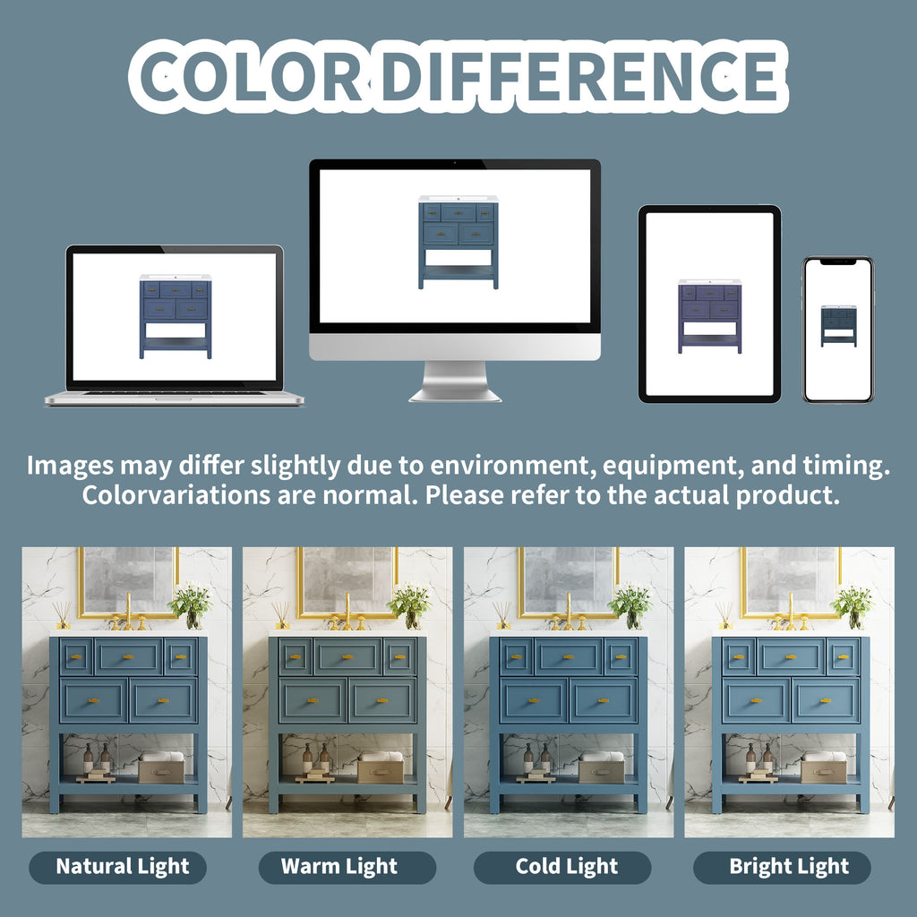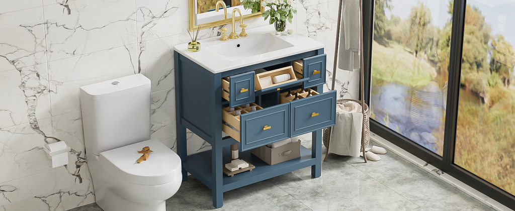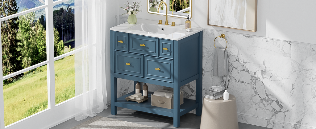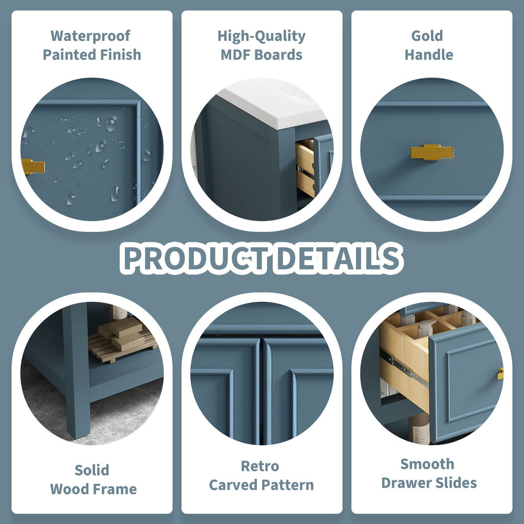 - [Modern Design]The unique blue and gold bathroom vanity has extraordinary visual enjoyment under the illumination of the bathroom lamp. Sophisticated looks combined with functional construction will grace your bathroom.