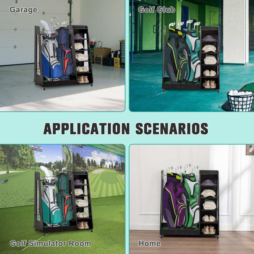 • 【SECURE & NEAT ORGANIZATION】This golf organizer features a versatile design, easily accommodating 2 golf bags of most sizes. Its spacious shelves can hold 5 pairs of golf shoes , along with golf accessories such as balls, clubs, and towels. All items stay neatly organized within this well - structured unit.