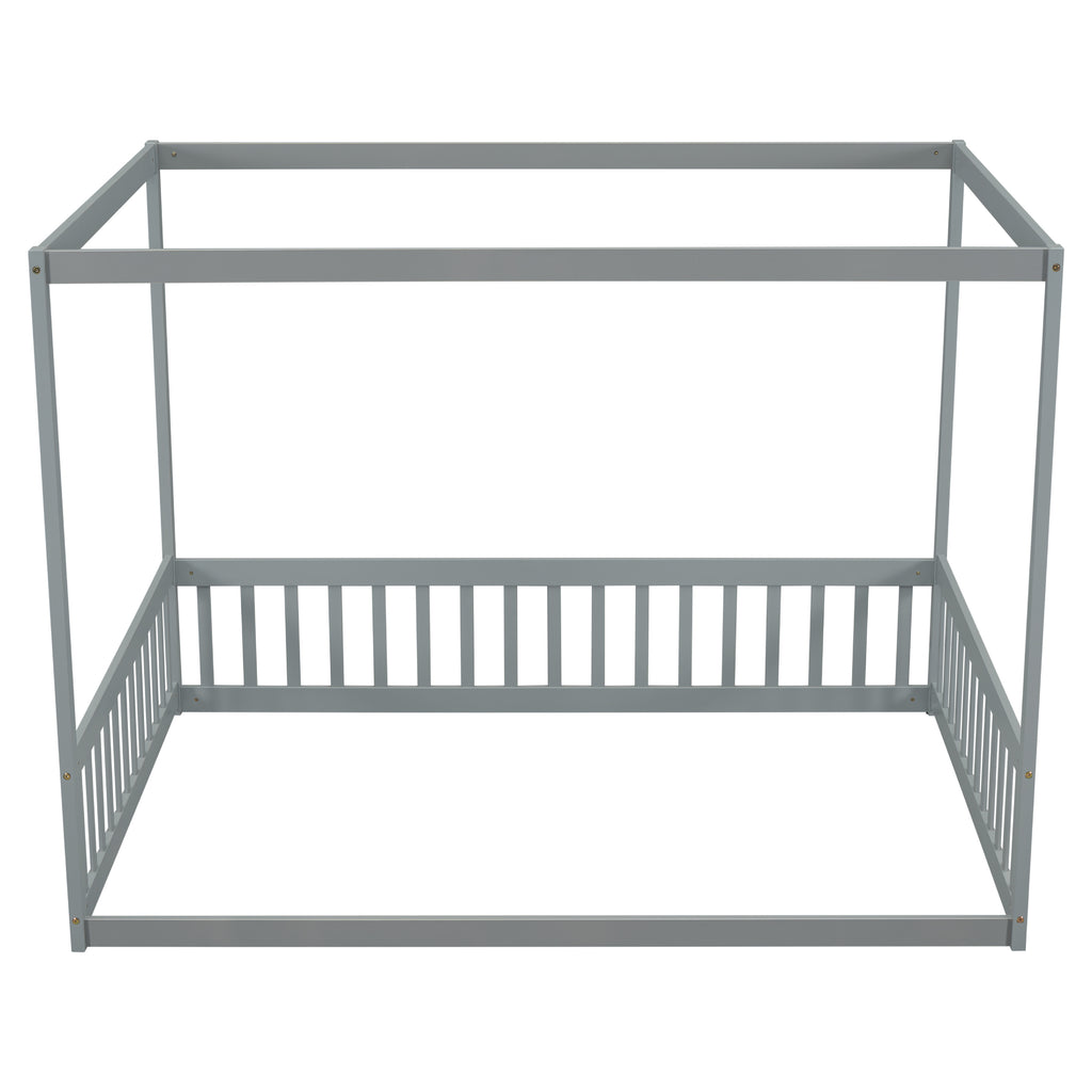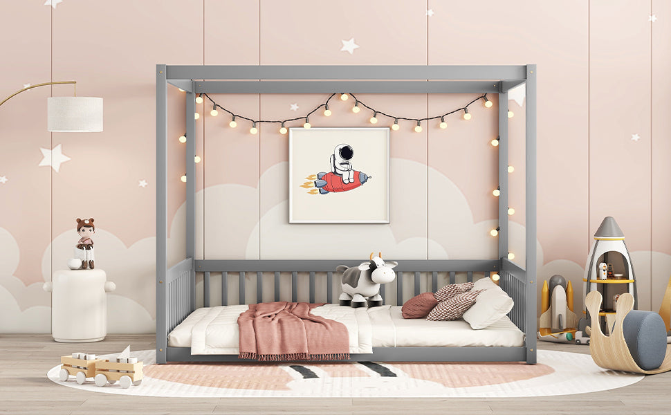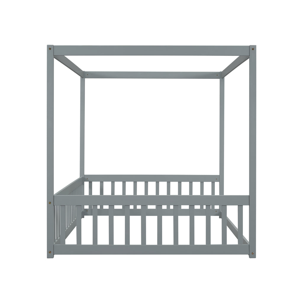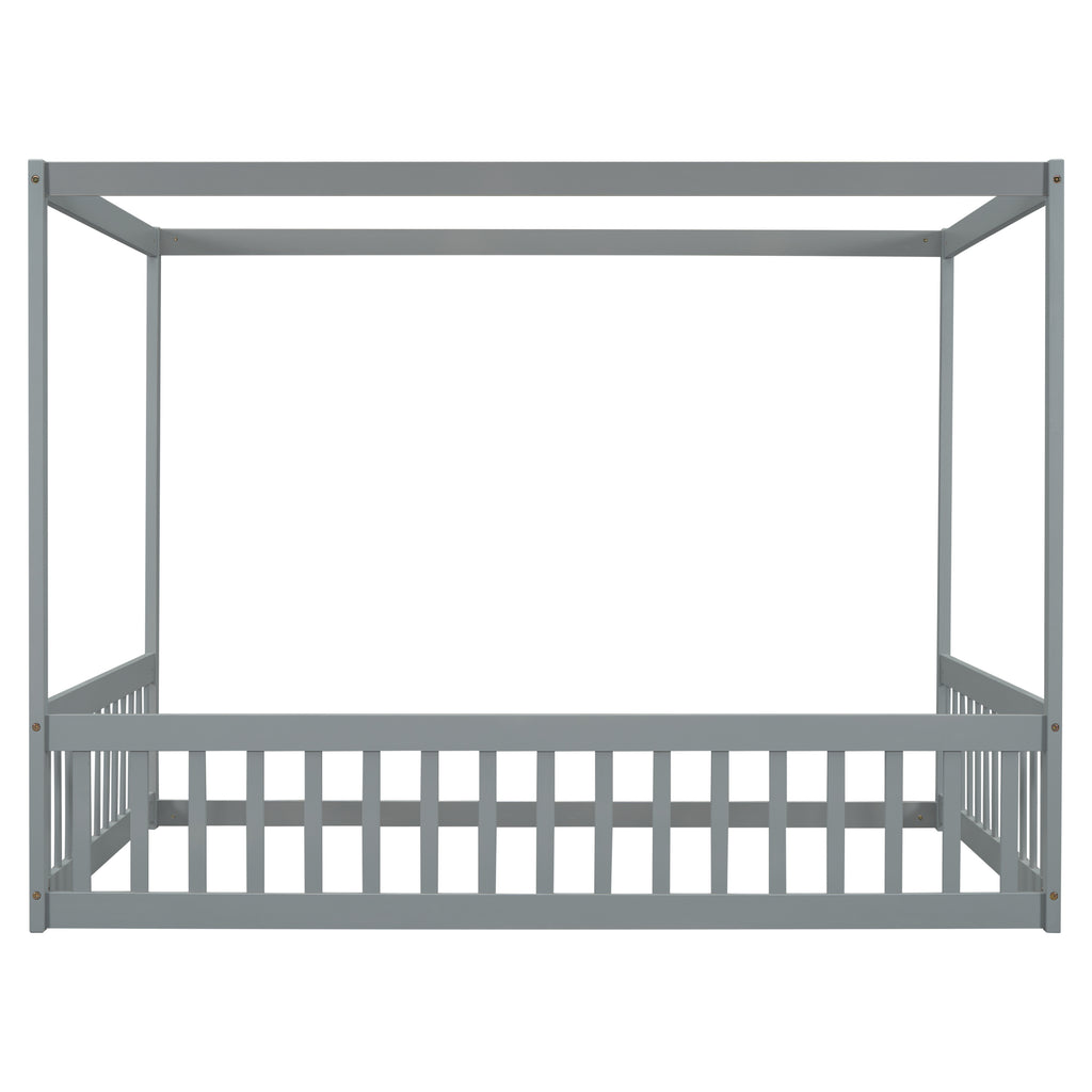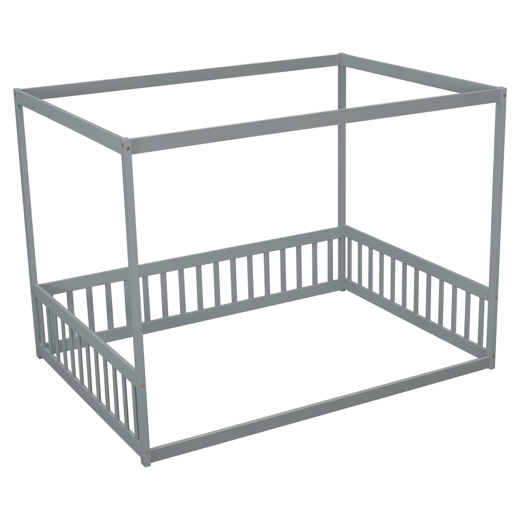 Full Size Canopy Frame Floor Bed with Fence, Guardrails,Grey