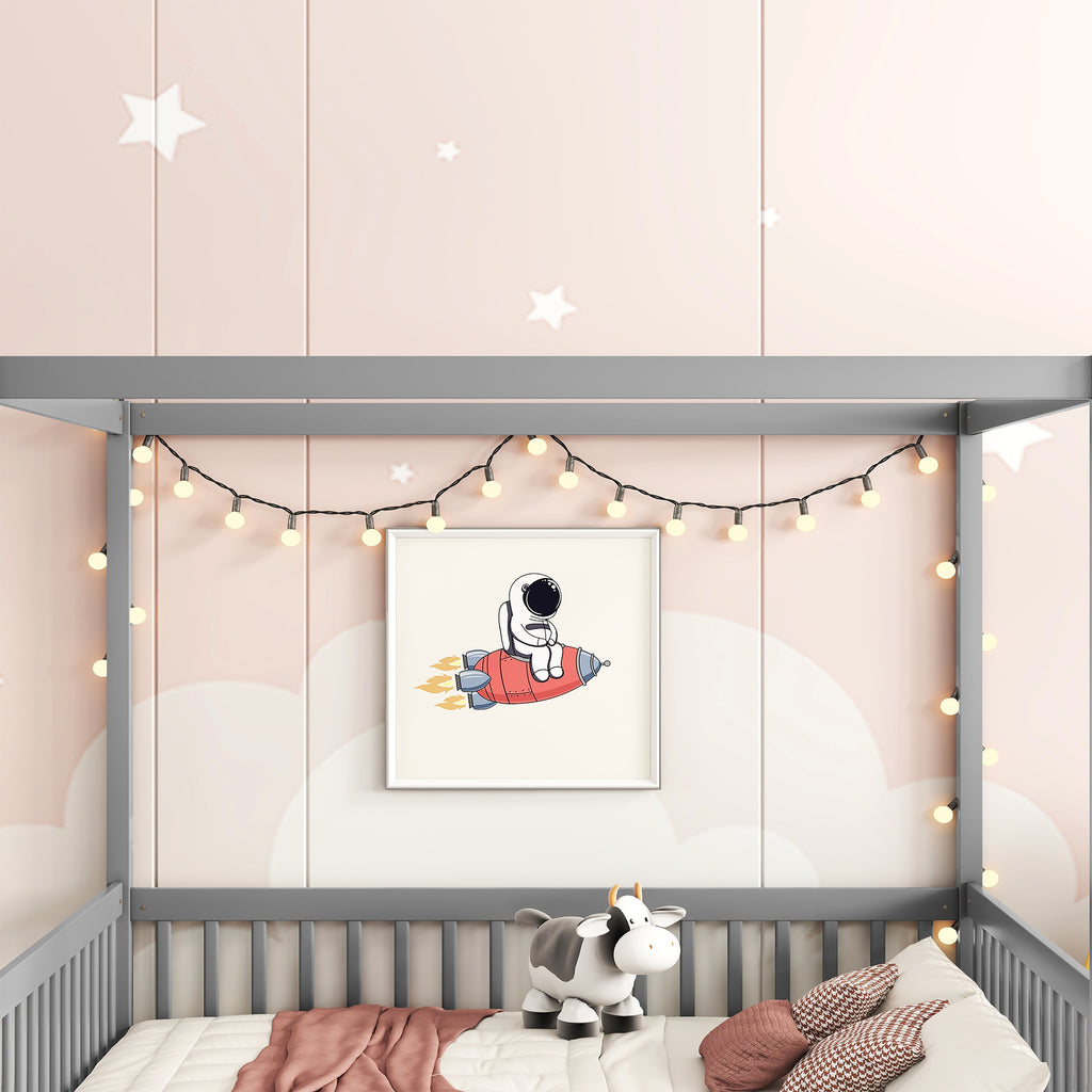 Full Size Canopy Frame Floor Bed with Fence, Guardrails