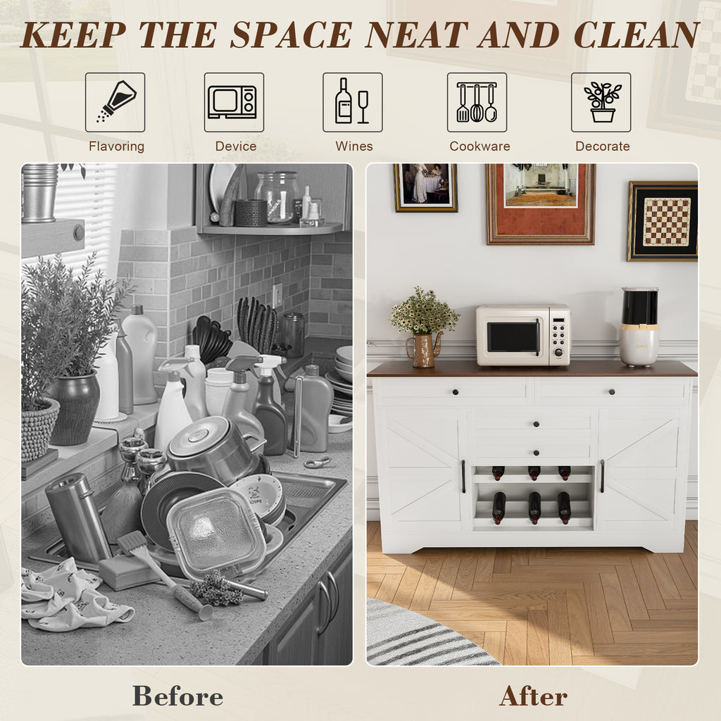 • Ample & Smart Storage:Stay organized with 4 spacious drawers and 2 cabinets—perfect for storing cutlery, cookware, and small appliances. Features a dedicated wine rack that holds up to 6 bottles of your favorite vintages. The upgraded 5mm drawer bottoms provide exceptional stability for all your kitchen essentials.