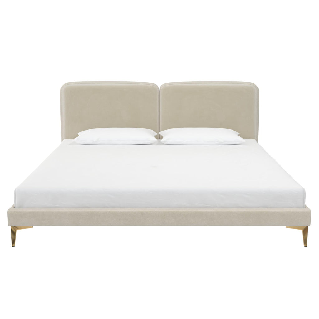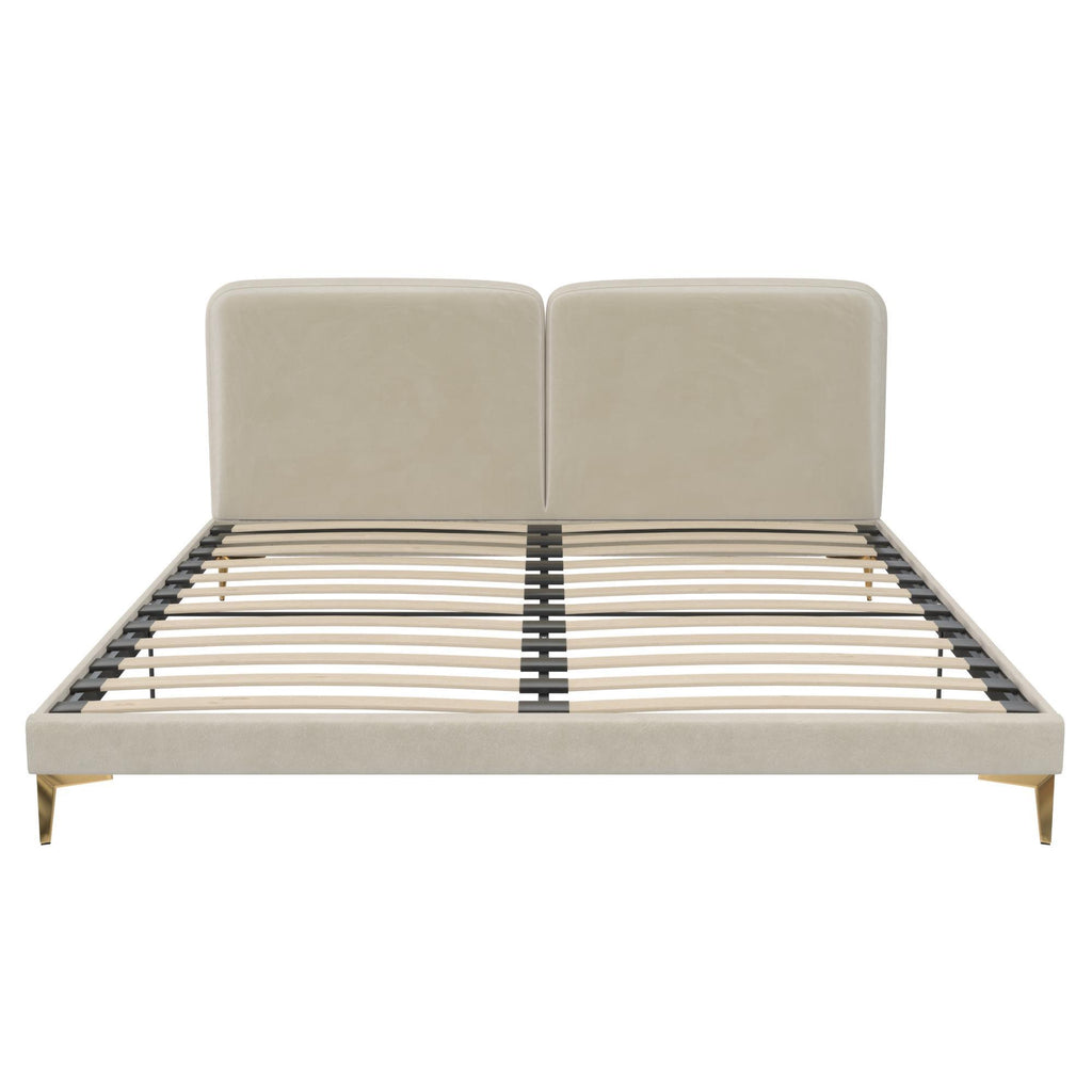 • A step above the rest, this velvet upholstered platform bed will give you all the feels with its rounded dual-panel and foam-padded sweetheart headboard made for two, low-profile space saving design, and modern high-gloss metal gold-plated legs