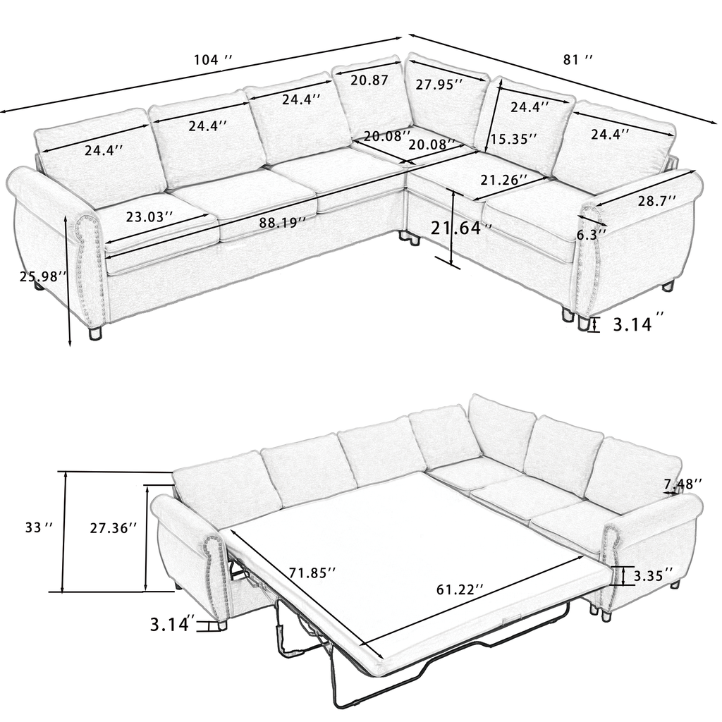 This sectional sofa is the perfect blend of size, style, and comfort. Measuring 104'D x 81'W x33'H, it's spacious enough to fit your entire family and provide ample seating for all your guests. The L-shaped design allows you to pull out the loveseats part in the middle to form a bed, increasing the space utilization of your living room. The sofa is made of high-quality materials including a sturdy wooden frame, metal legs, and soft polyester upholstery fabric. The seating experience is enhanced with spring packs, high-density sponge, and removable backrest cushions.