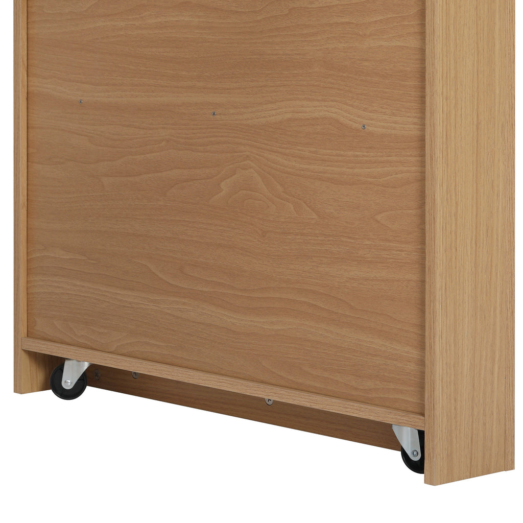 The bottom of the extendable tabletop and storage rack features two movable casters. This allows you to effortlessly pull out the tabletop and storage rack when in use. It enhances the product's mobility, making it adaptable to various spaces in your home.
