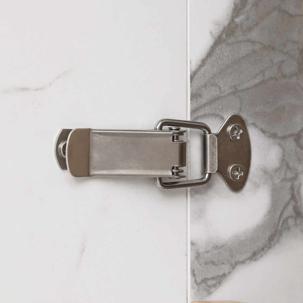The metal locking mechanism beneath the tabletop securely fastens each tabletop to the cabinet frame. This enhances overall stability and functionality, ensuring the product remains firmly connected and free from wobbling during use.