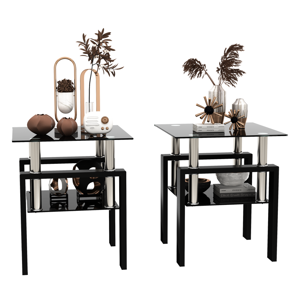 Modern Tempered Glass Tea Table Coffee Table End Table Set in Black with Metal Legs, 17.72 x 17.72 x 20.5 Inches