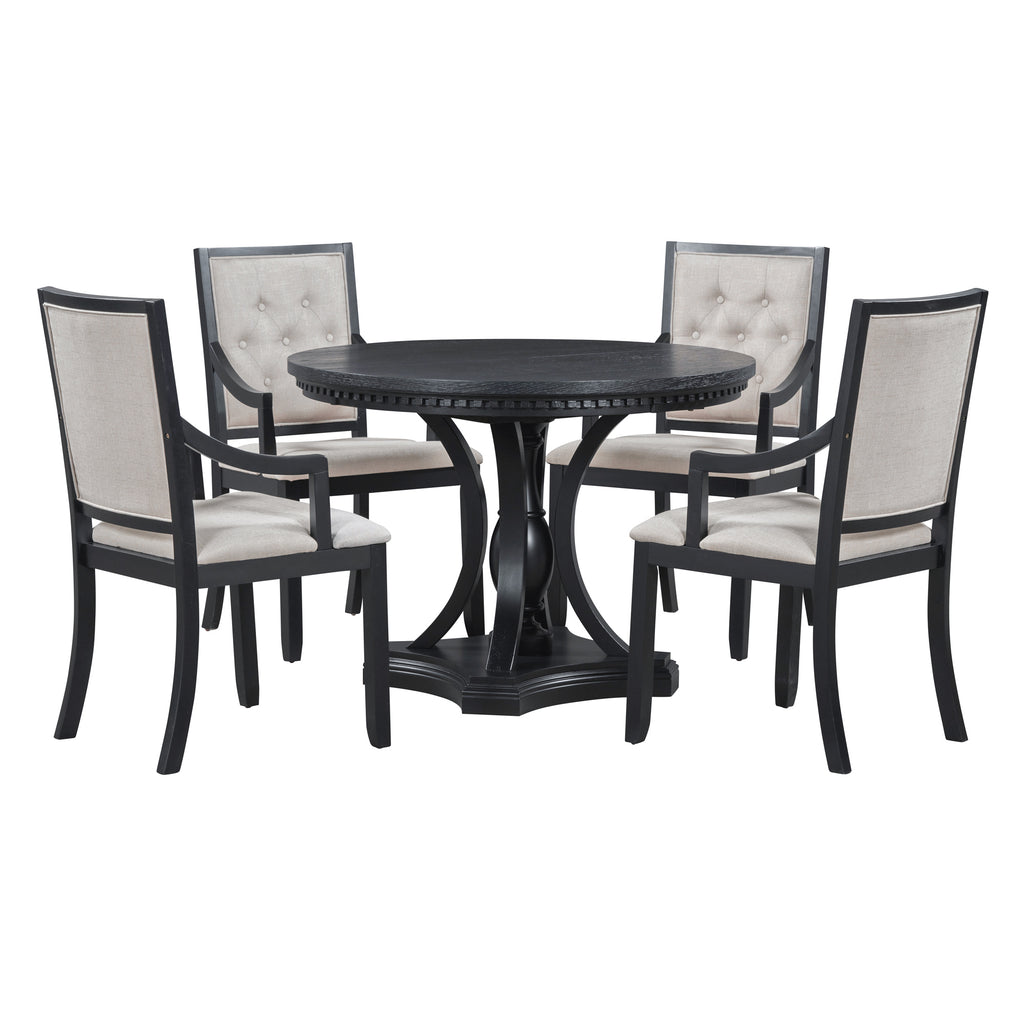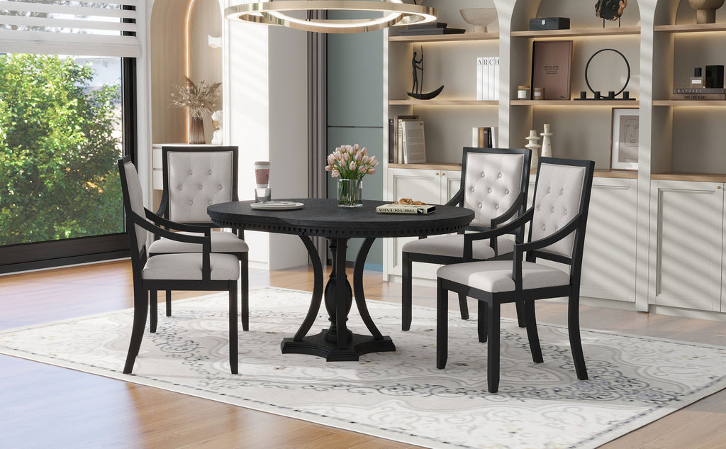 - 5-piece Dining Set: Retro-style dining set, including a round table and four chairs. Can accommodate 4 people. Perfect for the whole family to enjoy a sumptuous dinner together. With a strong farmhouse feel, this dining set creates a romantic and elegant atmosphere for your dining room.