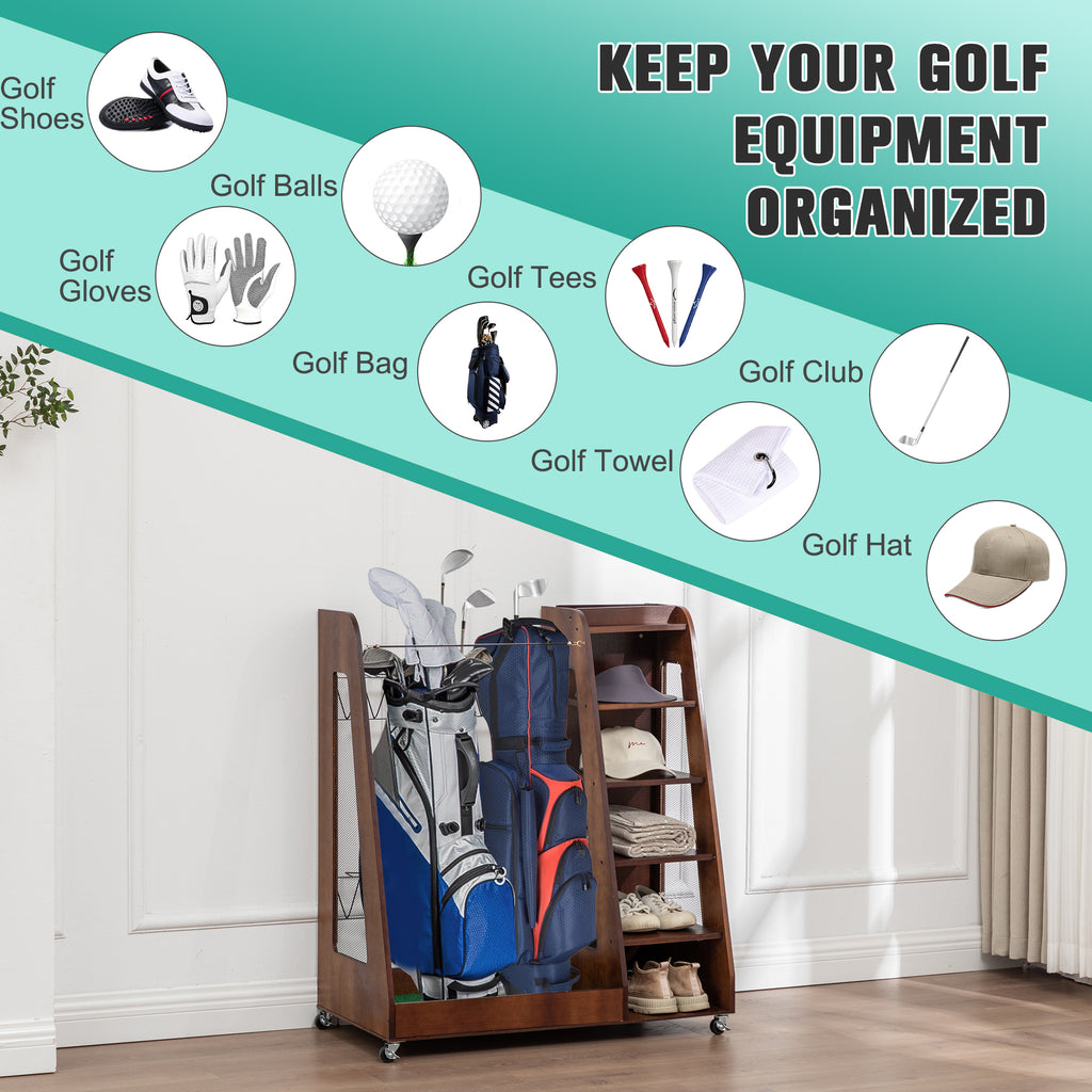 • 【 MULTI - FUNCTIONAL & MOBILE】This golf organizer is suitable for various locations, such as garages, home living rooms, and golf clubs. It comes with 4 wheels that can rotate 360°, allowing you to easily move it to any spot you want. And 2 of the wheels can be locked to ensure it stays stable when in place.
