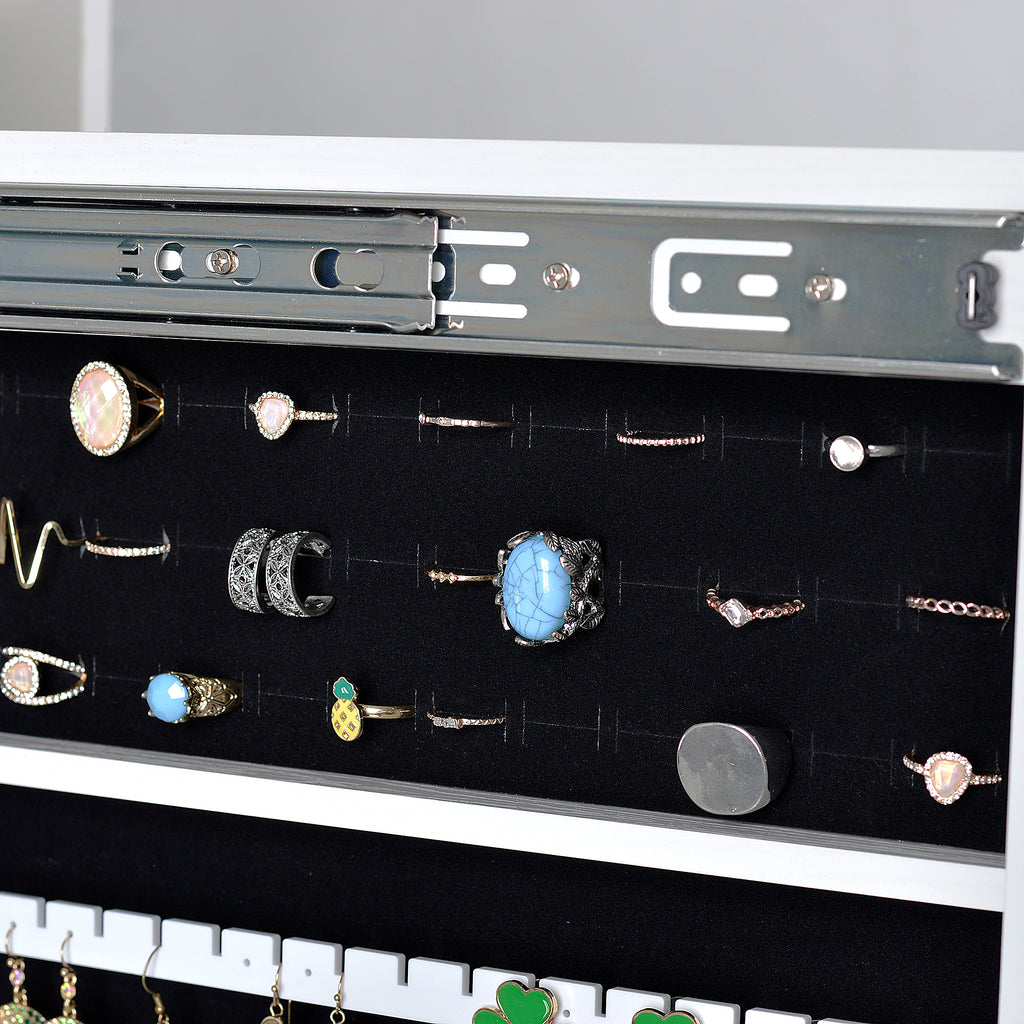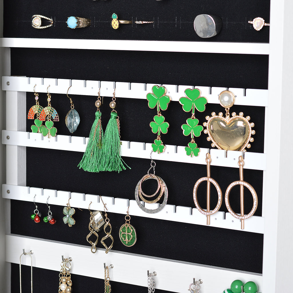 • Ample storage:includes 22 necklace hooks,2 cubes,4 lined shelves and a bracelet rod,and plenty of room for rings and eqrrings.it can hold on the door or wall.