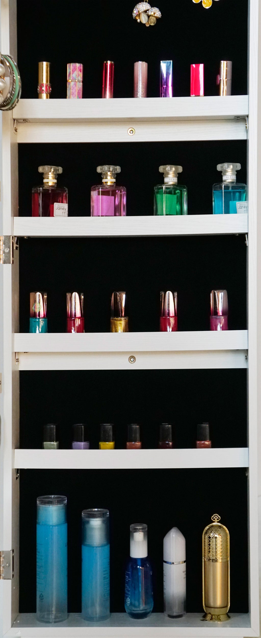 • Ample storage:includes 22 necklace hooks,2 cubes,4 lined shelves and a bracelet rod,and plenty of room for rings and eqrrings.it can hold on the door or wall.