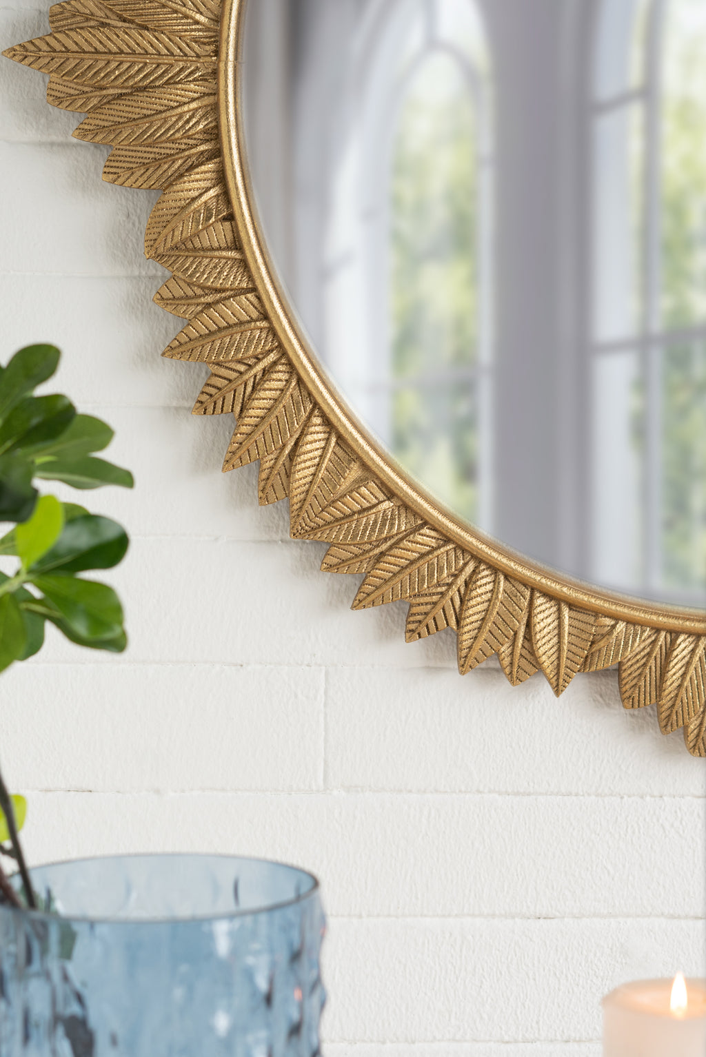 Drawing inspiration from vintage Rococo art, this mirror features a round, carved silhouette finished in soft gold to complete the ornate look. Perfectly sized to make a statement in any living room, hallway, or bedroom, it will infuse your decor with a burst of neoclassical charm.