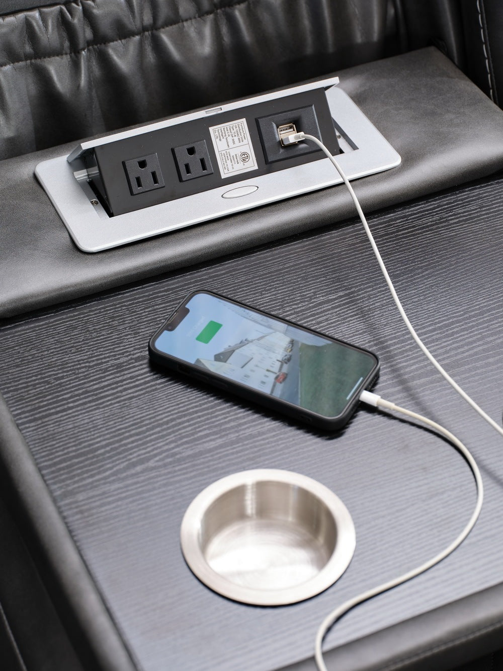 Drop down table with stainless steel cup holders, USB port, plugs