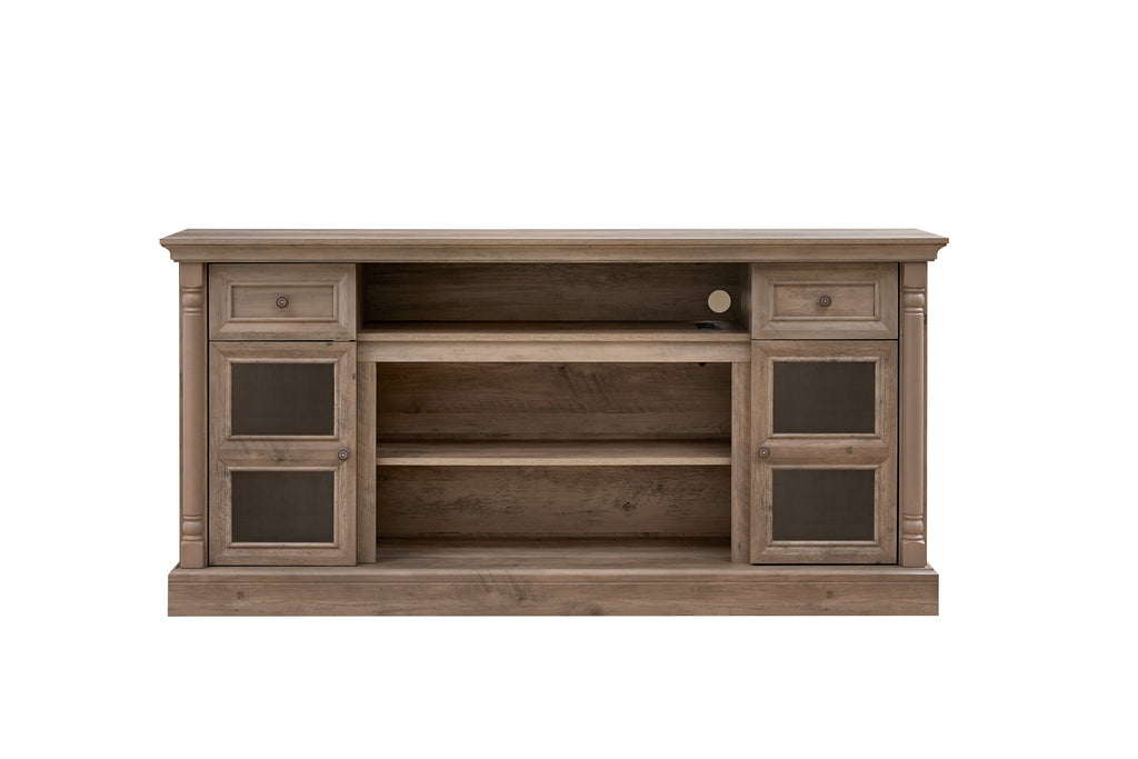 • Featuring an antique woodgrain finish with delicate Roman column detailing adorning the sides, the TV stand maintains its natural, rustic character while adding a touch of sophisticated and elegant vintage flair to your space.