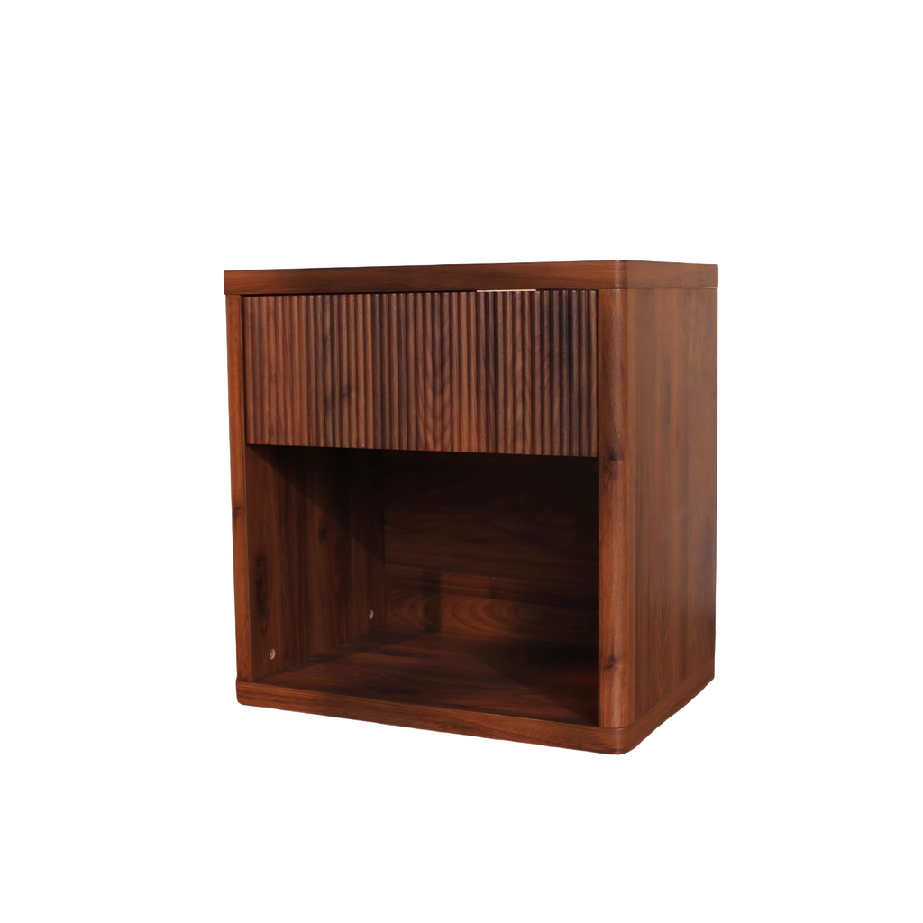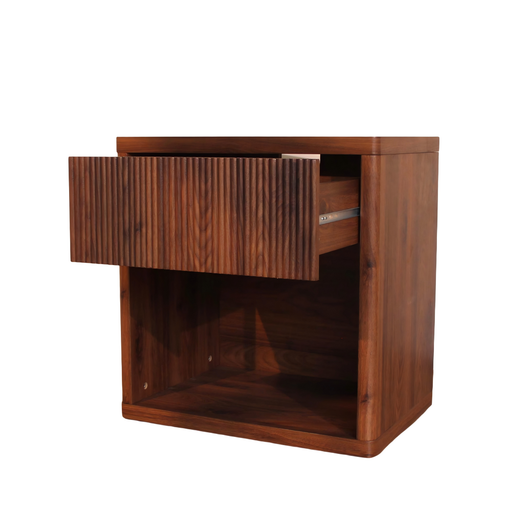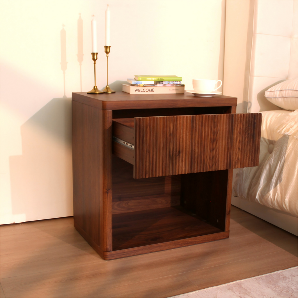 - Our bed side table boasts a minimalist curve profile and a drawer with a unique waveform panel, perfectly balancing modern aesthetics with functional design. The chic appearance complements various bedroom styles, from contemporary to mid-century modern. The smooth lines and rounded corners make it safe for kids and families, creating a standout piece that elevates the ambiance of your room.