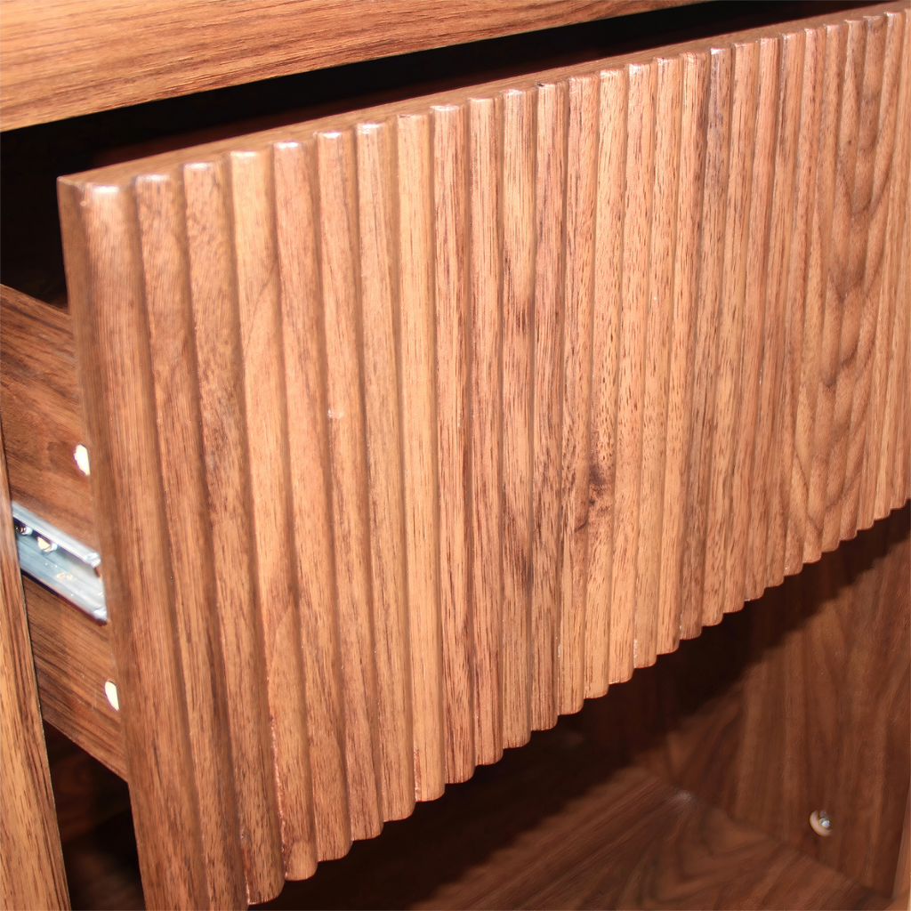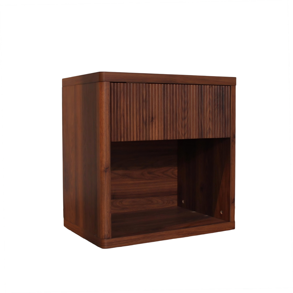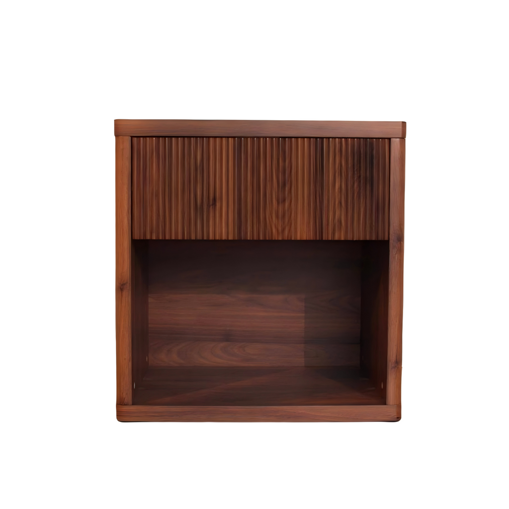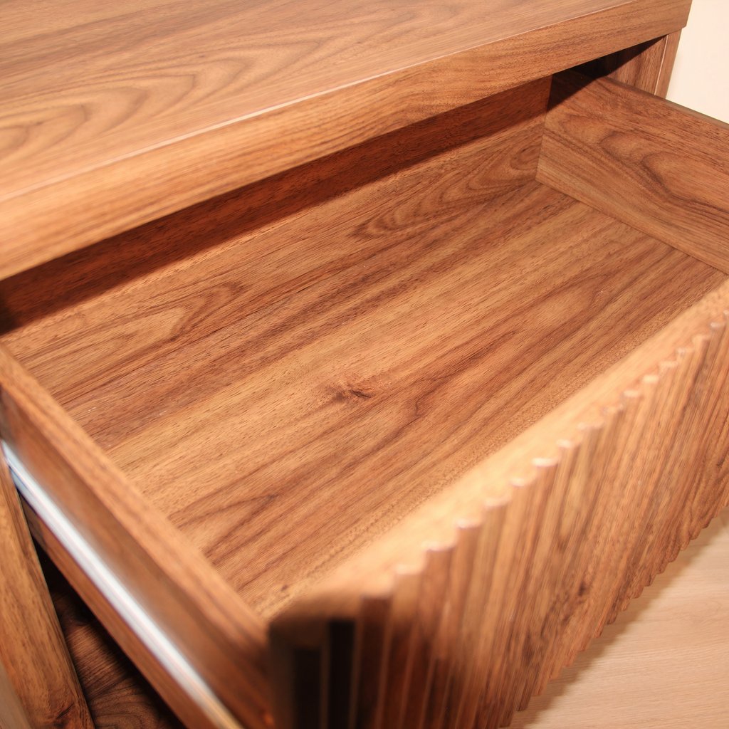 - Our bed side table boasts a minimalist curve profile and a drawer with a unique waveform panel, perfectly balancing modern aesthetics with functional design. The chic appearance complements various bedroom styles, from contemporary to mid-century modern. The smooth lines and rounded corners make it safe for kids and families, creating a standout piece that elevates the ambiance of your room.