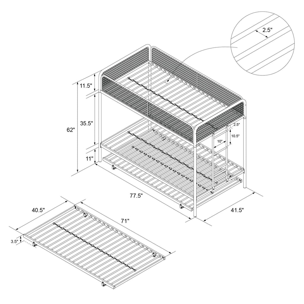 Make more space to play with the Isaiah Triple Twin Bunk Bed! This frame is the ultimate space saver and a perfect addition to your home. Made with a sturdy and strong metal frame, the Triple Twin Bunk Bed is the perfect solution for siblings sharing a room as it fits three standard twin size mattresses (sold separately). This frame has been conceived with safety in mind and therefore it includes 11.5-inch full-length guardrails on the top bunk, secured metal slats and a built-in ladder to climb up and down without any worries. The frame also includes a trundle, perfect for pajama parties or overnight guests - just pull it out and lock it in place with the easy-glide casters. The Triple Twin Bunk Bed has a sleek and simple silhouette making it perfect for any kind of décor. You can now let your children get creative with the extra space they have! Maximum mattress height for top bunk and trundle is 6 inches. Children must be at least 6 years old to use the top bunk and 3 years old to use the bottom bunks.