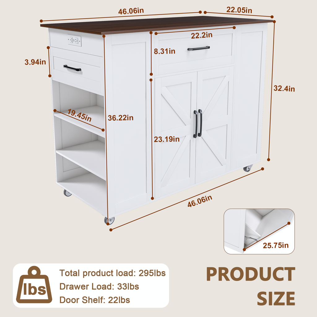 Rustic Movable Kitchen Island on Wheels with Storage & Power Outlet, White MDF Frame with Wood Top, 46'