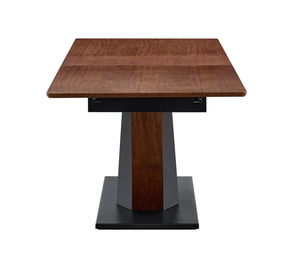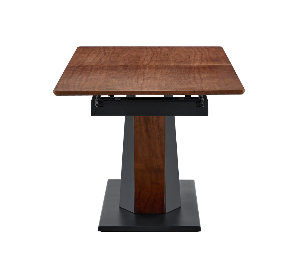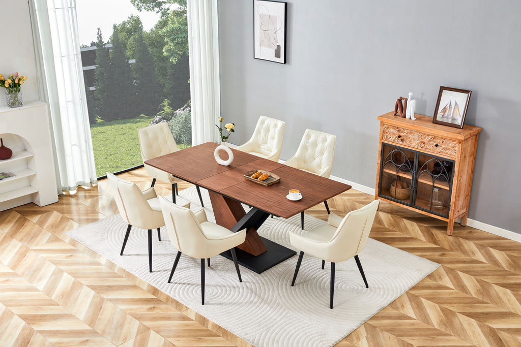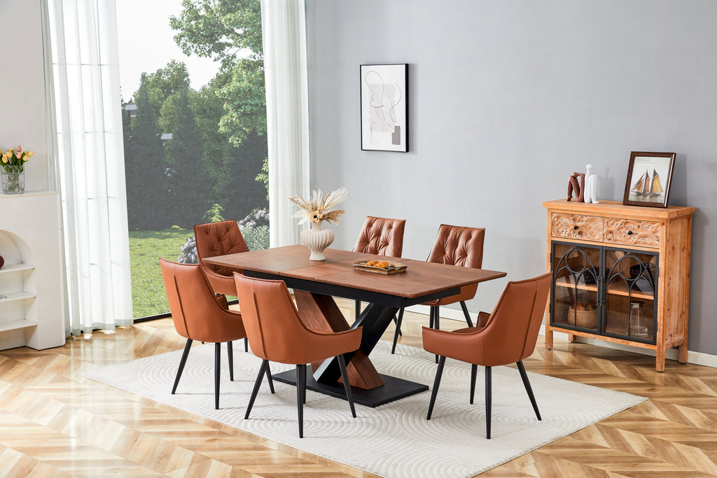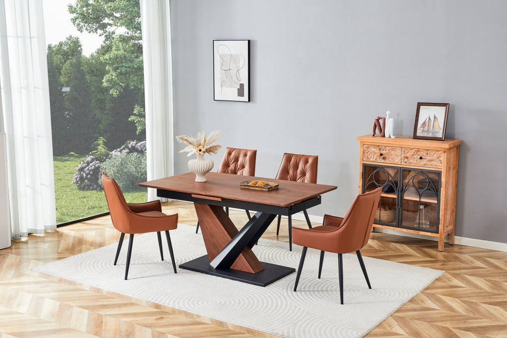 This extendable dining table combines style, durability, and functionality. The tabletop is made of high-quality MDF with real wood veneer, showcasing a natural and refined wood grain texture that is smooth, scratch-resistant, and easy to clean, ensuring long-lasting use. The metal cross-shaped base features a black and brown contrast design that adds an artistic, modern look while providing excellent stability and strong load-bearing capacity. The extendable tabletop expands smoothly, allowing flexible use for both compact and spacious settings — perfect for family gatherings, dining, or office meetings. Its minimalist yet elegant design blends beautifully with modern, light luxury, and contemporary interiors, making it a versatile centerpiece that enhances any space.